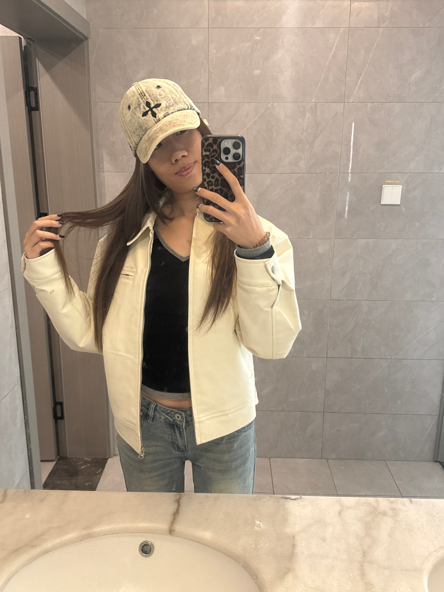 A young woman is taking a selfie in a bathroom with light gray marble tiles and a white marble sink. She is wearing a beige denim hat with a black cross, a black top, a cream-colored leather jacket, a…read more