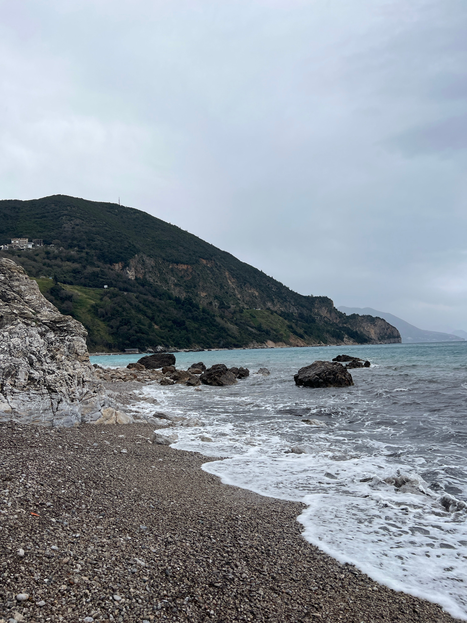 The image depicts a pebble beach along the coast of Prijevor, Montenegro, on a cloudy day. The sea, with foamy waves, meets the shoreline, which is composed of small, dark pebbles. Large rocks are sca…read more