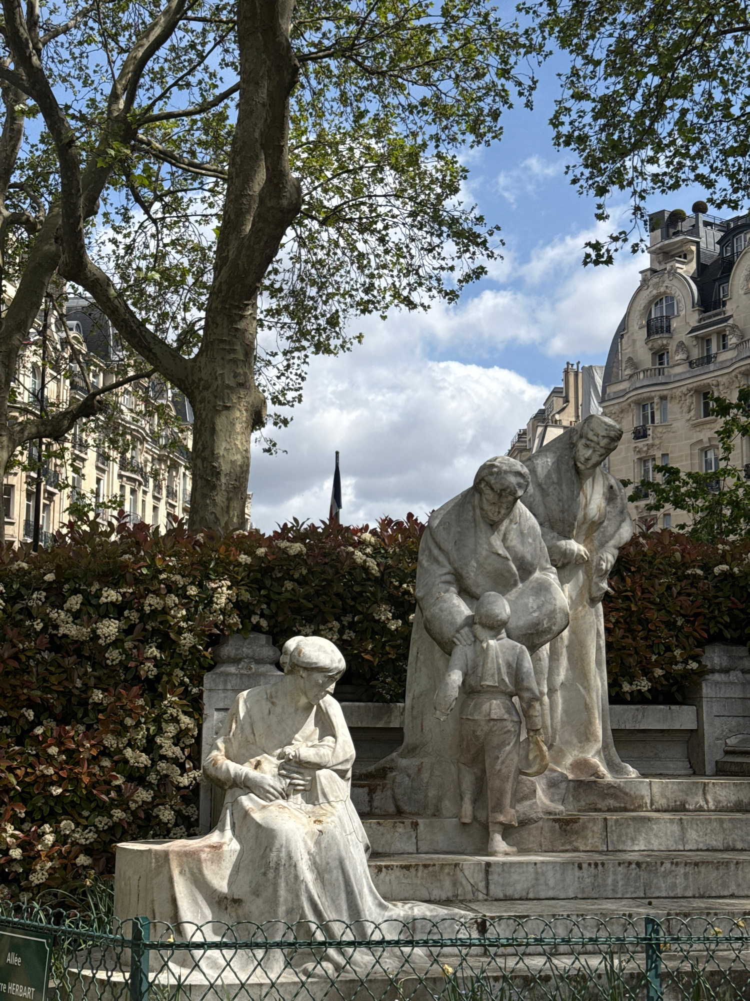 This image captures a serene scene in a Parisian park or garden, featuring a prominent group of stone statues under a bright sky. In the foreground on the left, the sturdy trunk and branches of a larg…read more