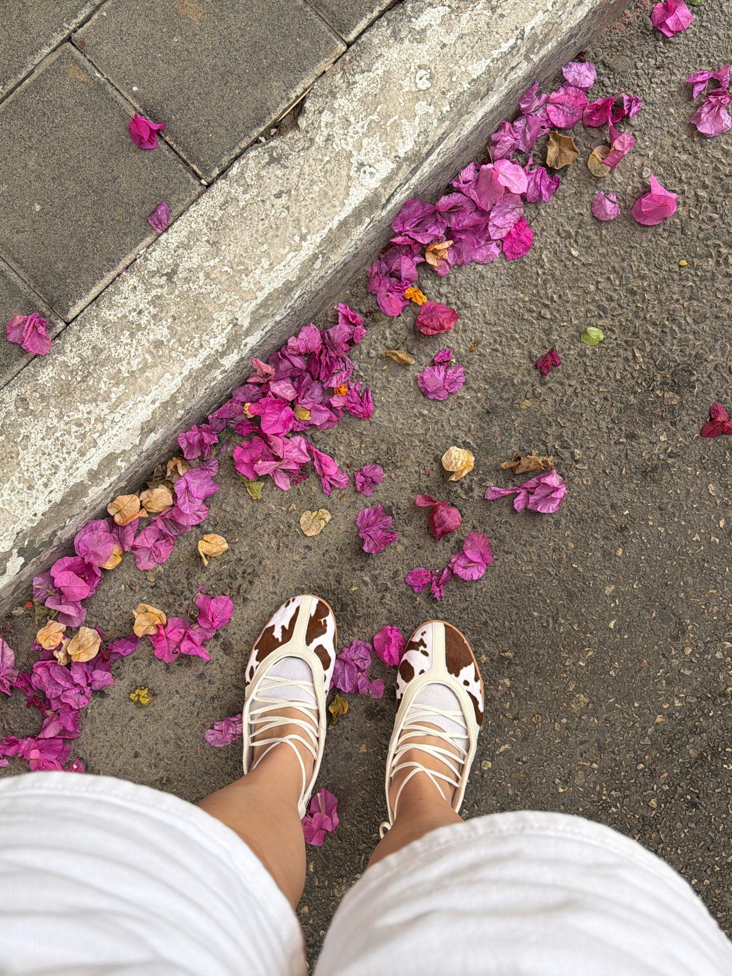 A ground-level shot shows a person standing on a sidewalk in Tel-Aviv, Israel. The sidewalk is a combination of concrete paving stones and asphalt, bordered by a concrete curb. Scattered on the asphal…read more