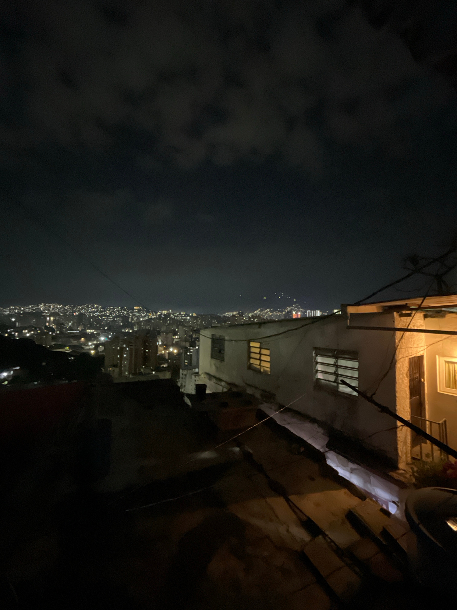 The image shows a nighttime view of Caracas, Venezuela from a high vantage point. On the right side of the image are the exterior of buildings with windows and weathered walls. On the left side of theβ¦read more