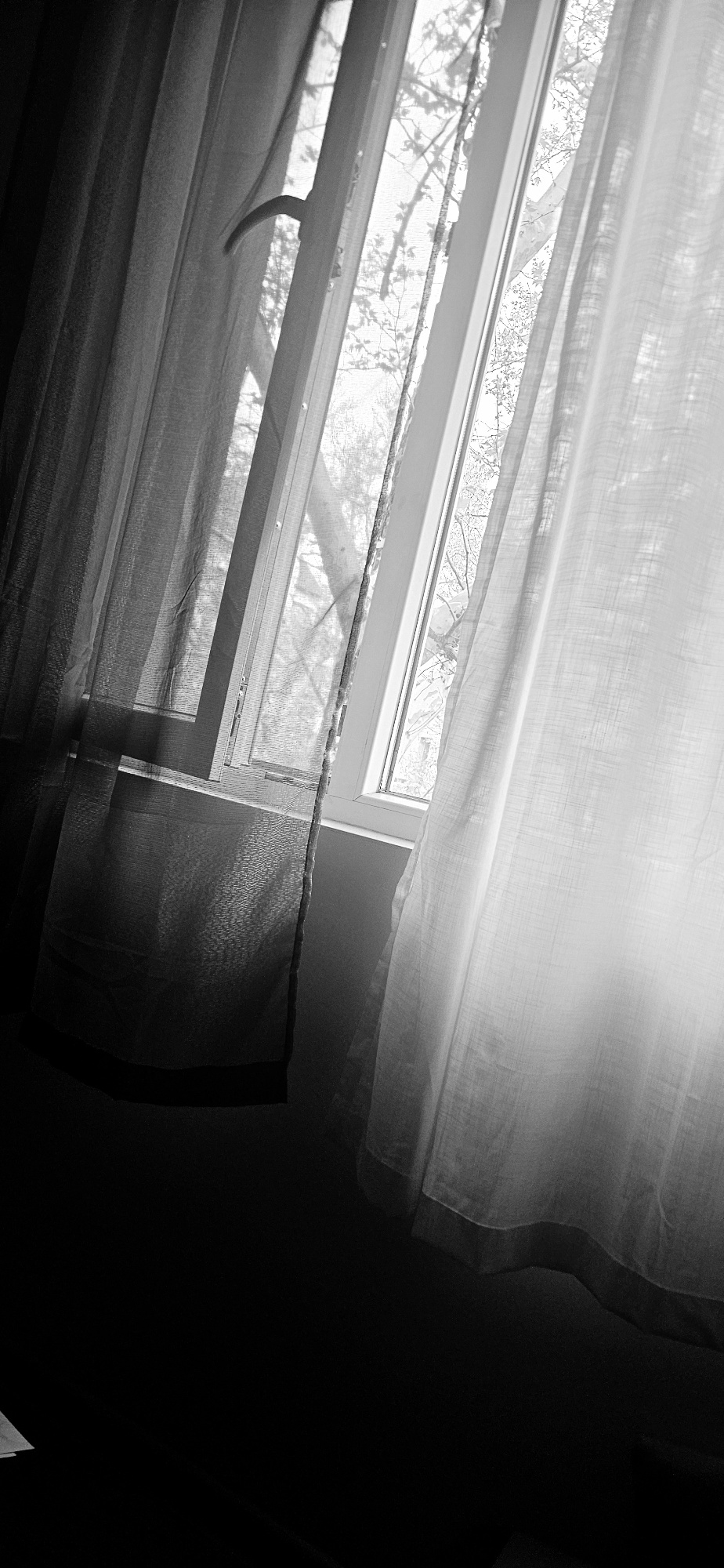 A black and white, low-angle shot depicts a window with sheer curtains in an interior space. Light enters through the window, revealing a view of leafless trees outside, likely indicating a winter sce…read more