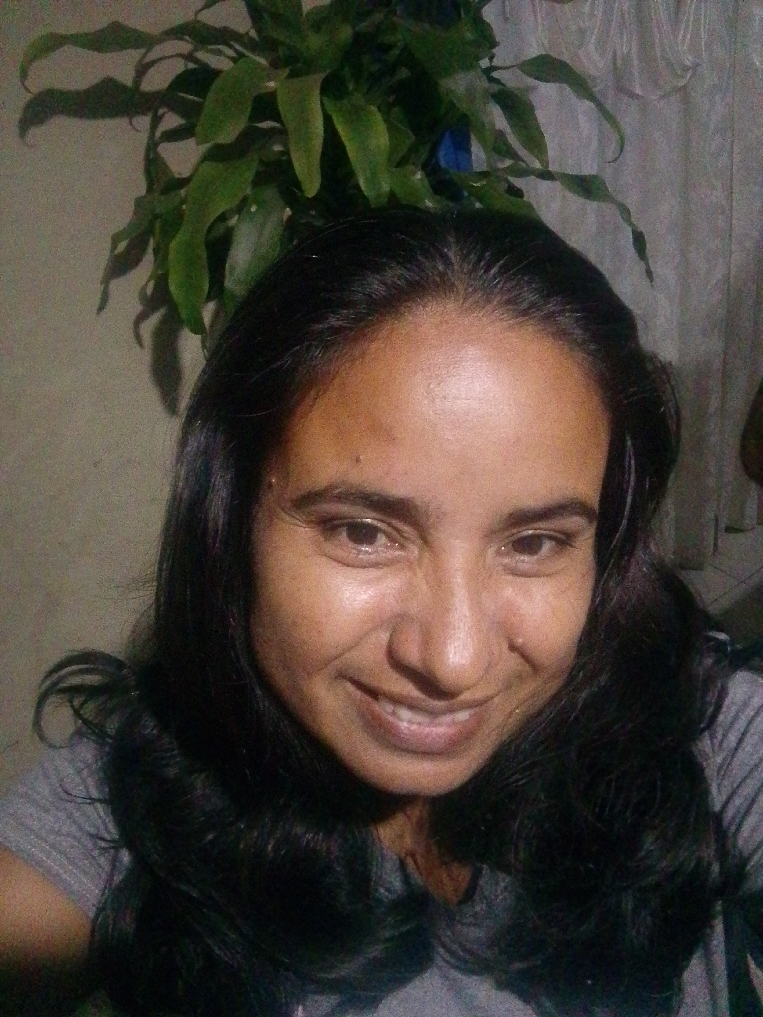 A medium shot photograph shows a woman smiling, facing forward. Her long, dark, wavy hair frames her face. She is wearing a grey t-shirt. Behind her and slightly above her head is a potted green plant…read more