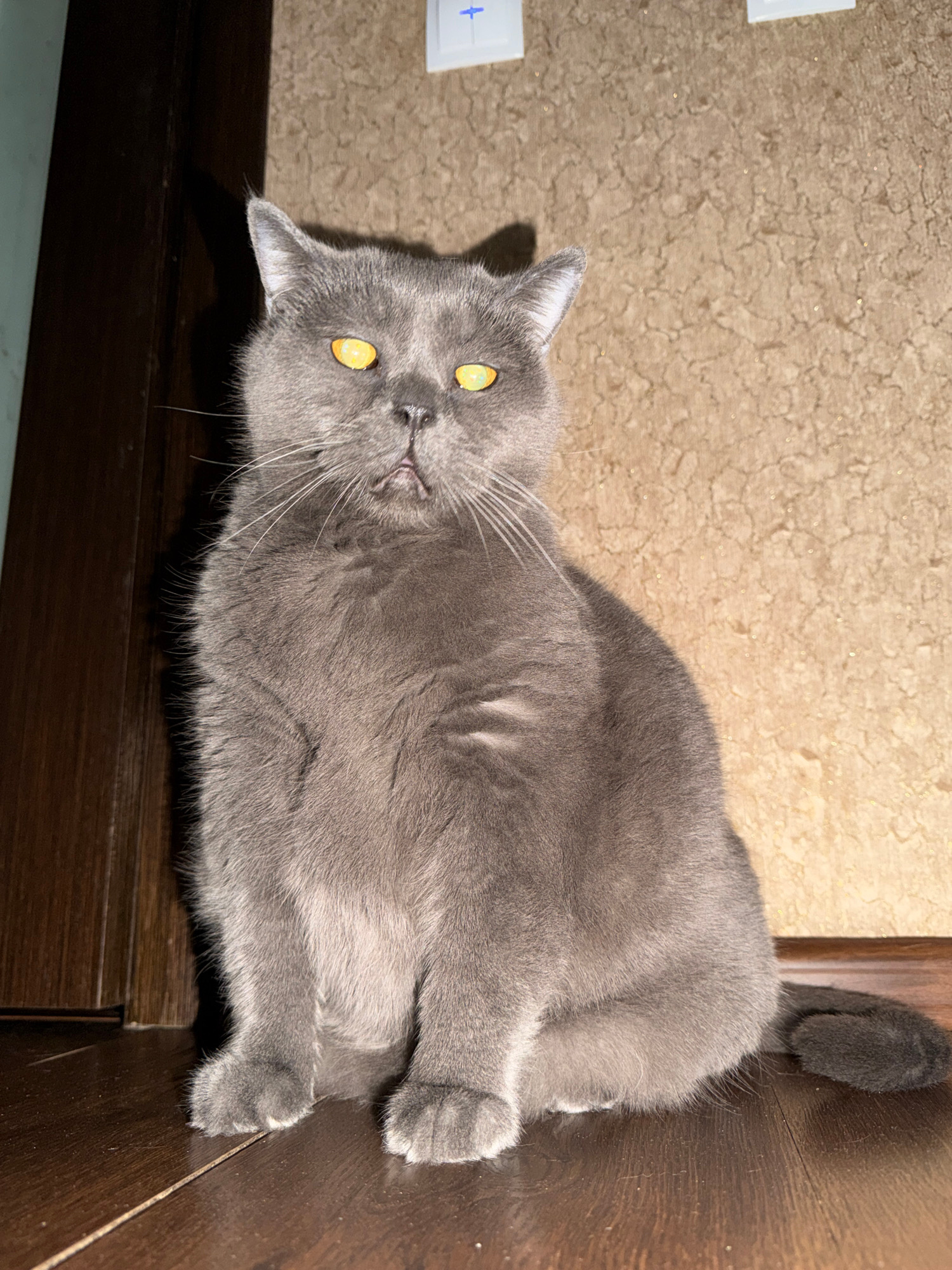 A fluffy grey cat with striking yellow-orange eyes is the central subject of the image, seen from an overhead perspective. The cat's body is oriented mostly horizontally, stretched out on a floor that…read more