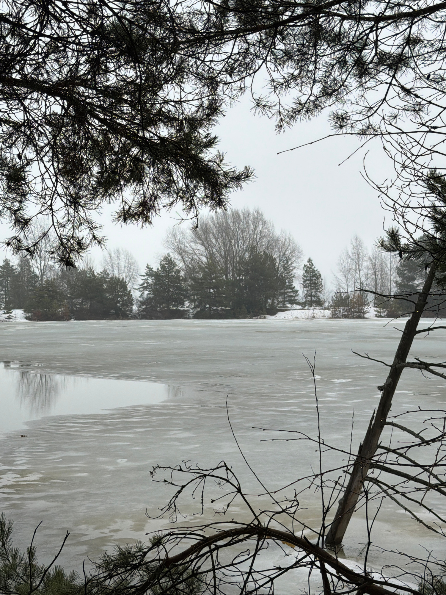 A partially frozen body of water is framed by bare trees in the foreground. The water's surface is textured with patterns suggesting ice or a semi-frozen state. The background is obscured by fog or lo…read more