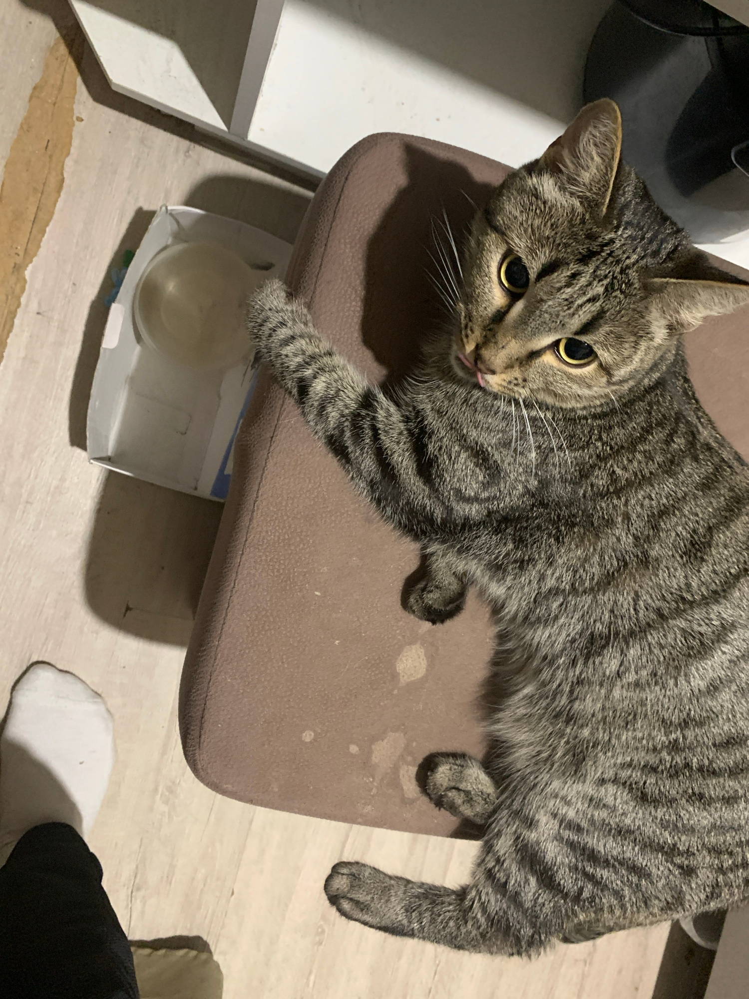A gray tabby cat is lying on a brown upholstered chair. The cat is facing left with its head near the top left of the frame and its body extending diagonally to the right. The cat has yellow eyes andβ¦read more