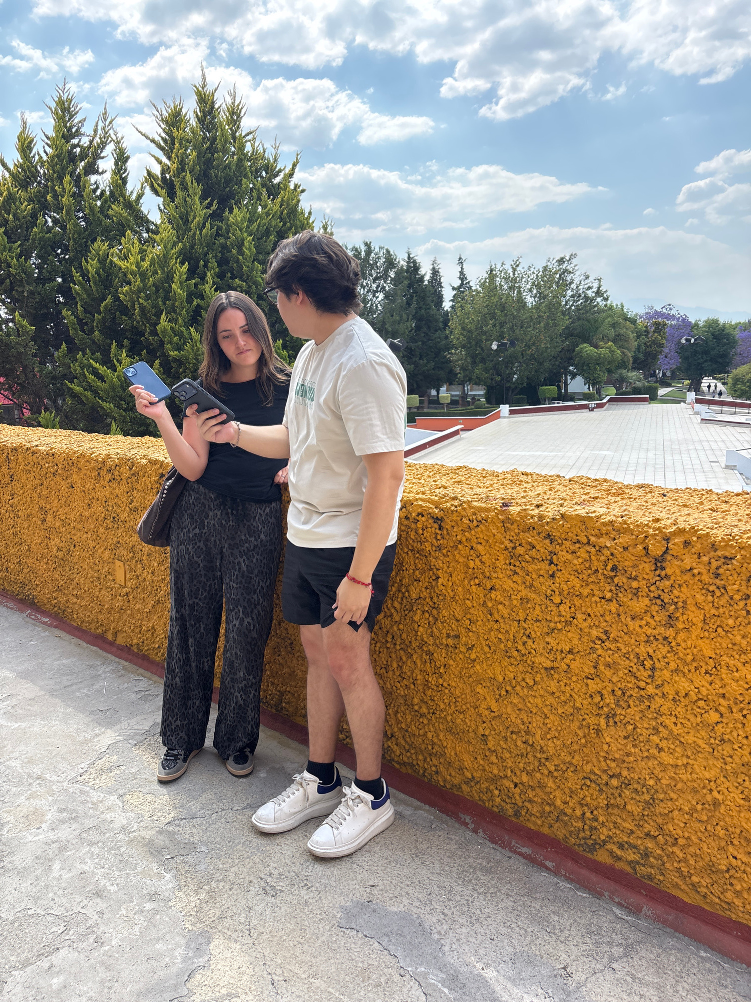 An outdoor, vertical format full shot captures two young individuals standing on a concrete path next to a prominent, textured yellow wall on a sunny day in San Andrés Cholula, Mexico. The male, on t…read more