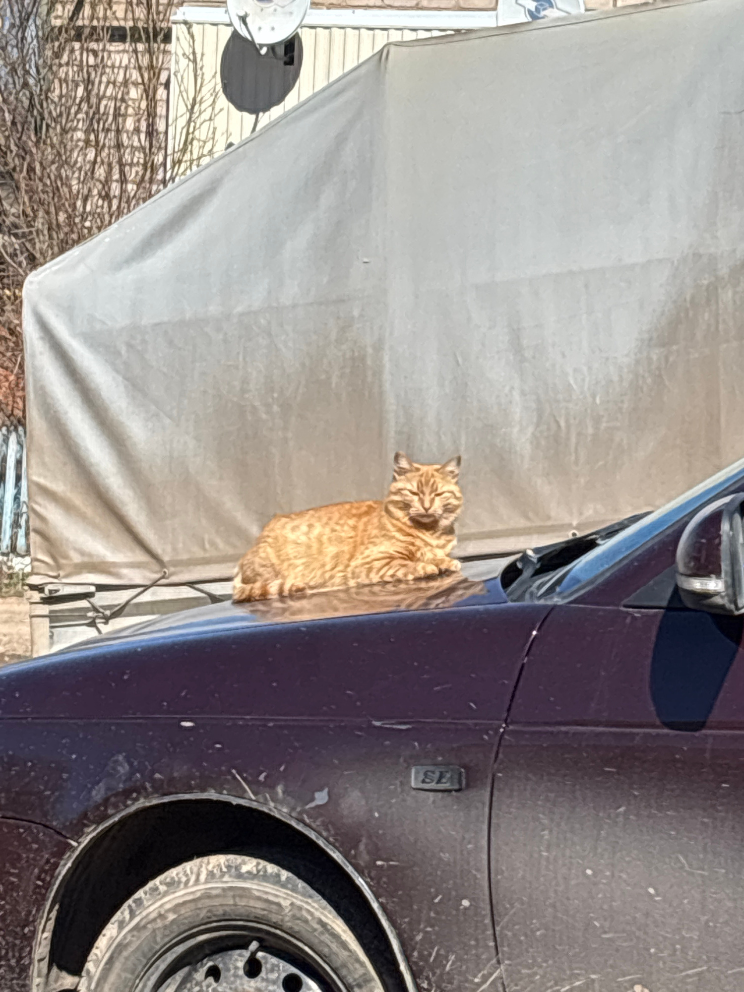 An orange tabby cat sits on the side of a dark-colored car. The car appears to be parked in an outdoor environment. A white, tent-like structure is situated beside the car. In the background, there ar…read more