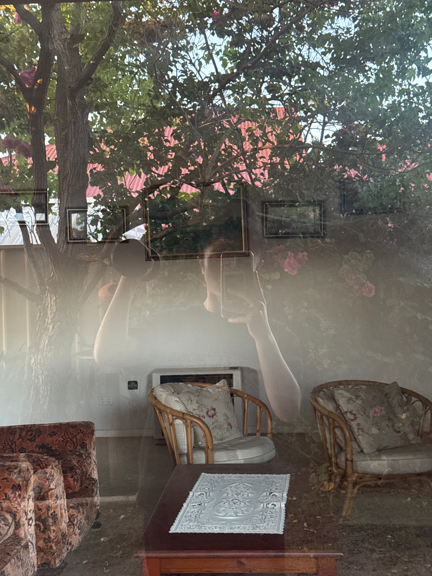 The image presents a double exposure effect. The primary subject is a tree with green leaves and pink flowers, suggesting a garden or park setting. Framed photographs appear to be hanging from the bra…read more