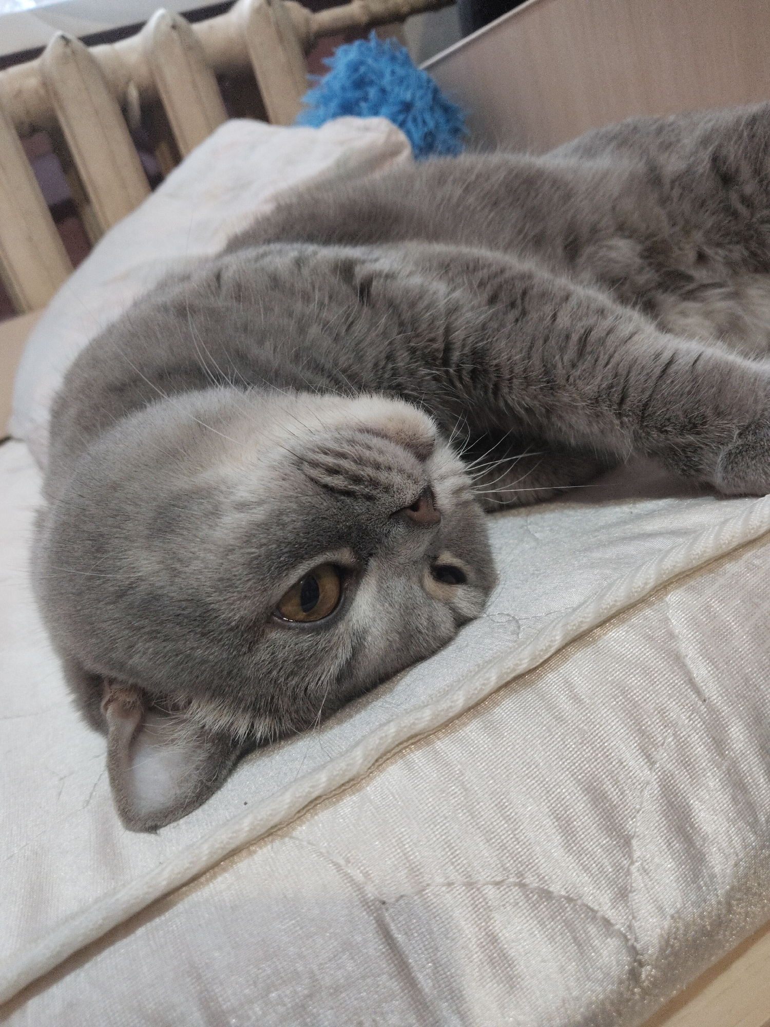 The image displays a close-up, slightly low-angle shot of a relaxed gray cat, likely a British Shorthair, resting indoors. The cat is lying on its left side on a light-colored, textured fabric surface…read more