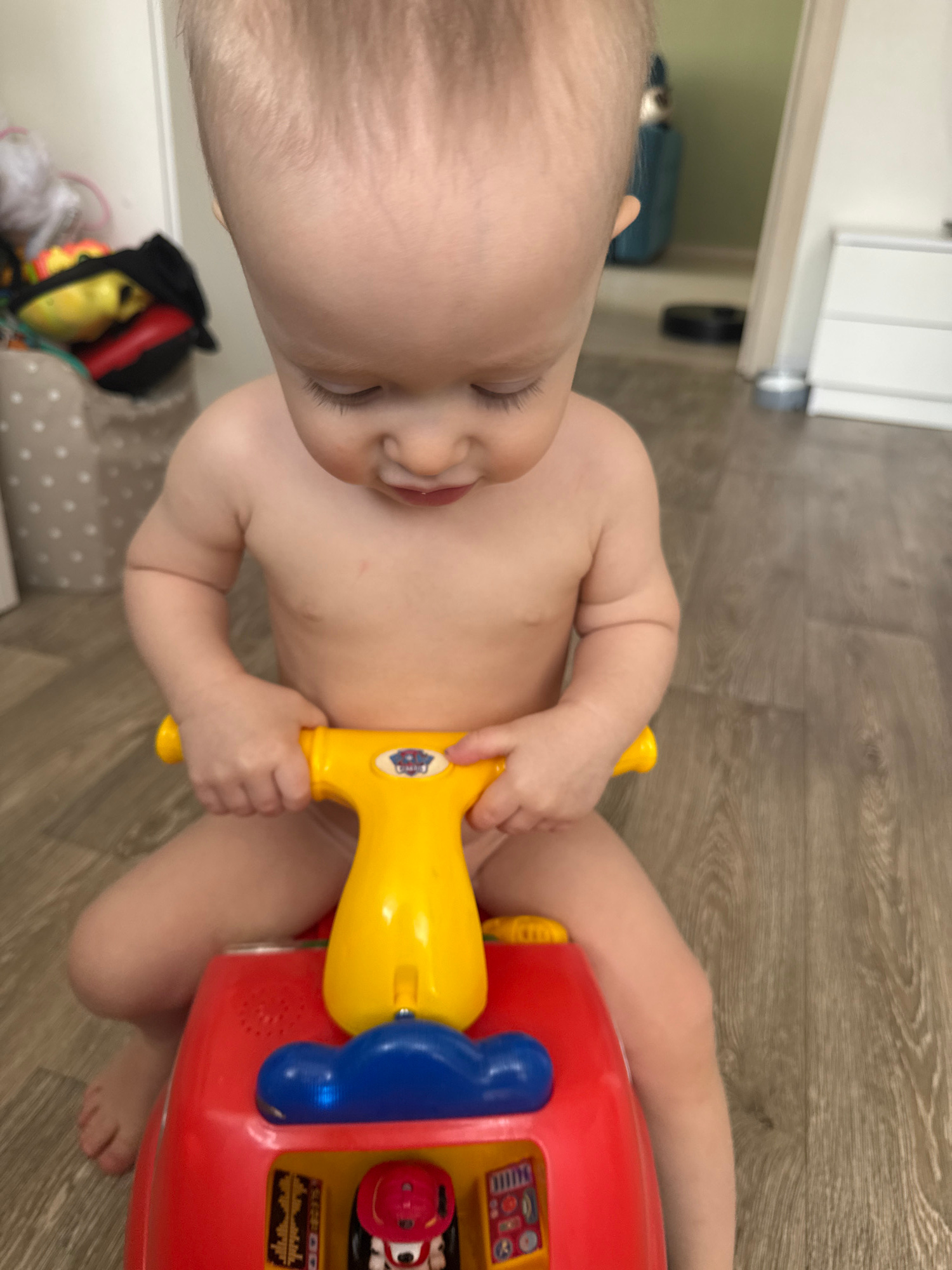 A baby is seated on the floor, playing with a red and yellow toy. The baby appears to be indoors on a wooden floor, with a door visible in the background. Additional toys are visible in a corner. No i…read more