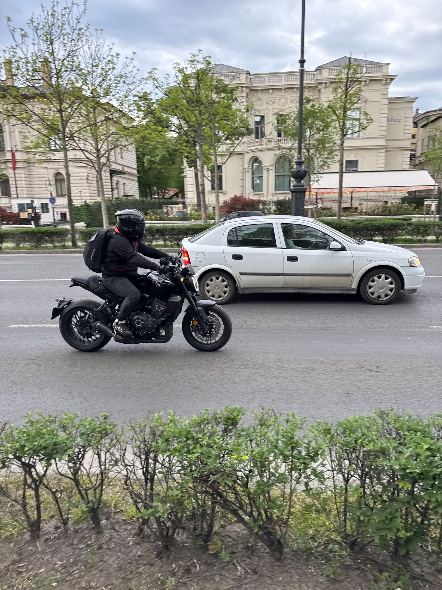 A motorcyclist wearing full black gear, including a helmet and a backpack, is captured stationary on a black motorcycle in an urban setting. The motorcycle is positioned near the rear of a white Opel…read more