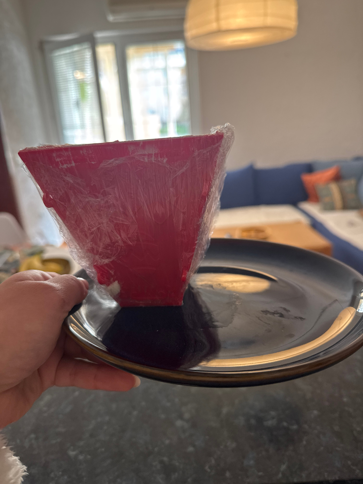 A person is holding a black plate in their right hand, with a piece of red cake wrapped in plastic cling film placed on the plate. The location appears to be indoors, possibly a home, given the presen…read more