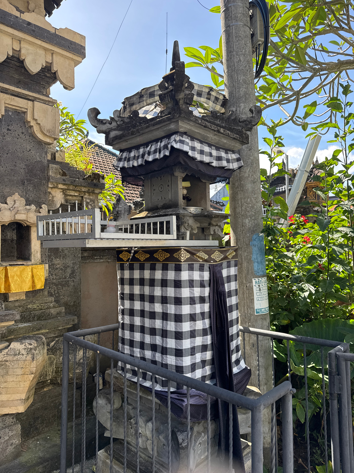 The image depicts a Balinese shrine or altar in Kuta Selatan, Indonesia. The shrine is adorned with a black and white checkered cloth and a gold-patterned sash. A metal staircase is located next to th…read more