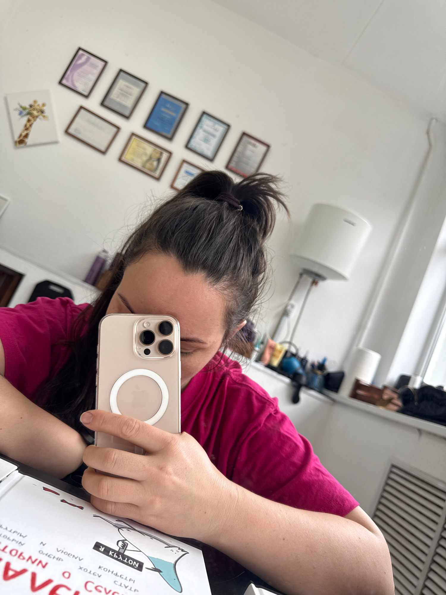 The image captures a casual indoor selfie taken by a person in Chaikovsky, Russia. The person, whose face is partially obscured by the phone, has dark hair tied back in a bun and is wearing a dark pin…read more
