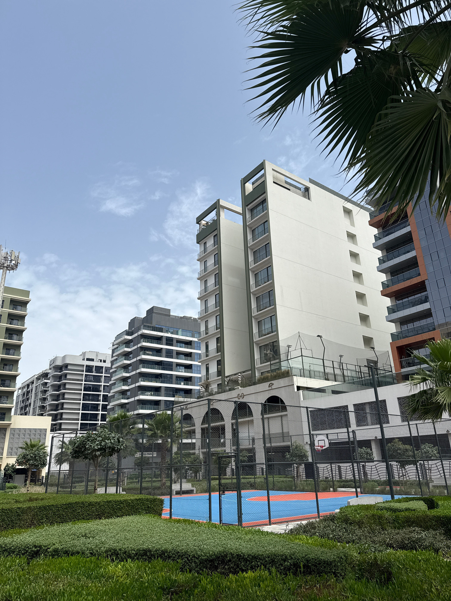 The image is a low-angle shot of buildings in Dubai, United Arab Emirates. The architecture is modern, with tall, multi-story buildings featuring geometric designs. A palm tree is visible in the foregβ¦read more