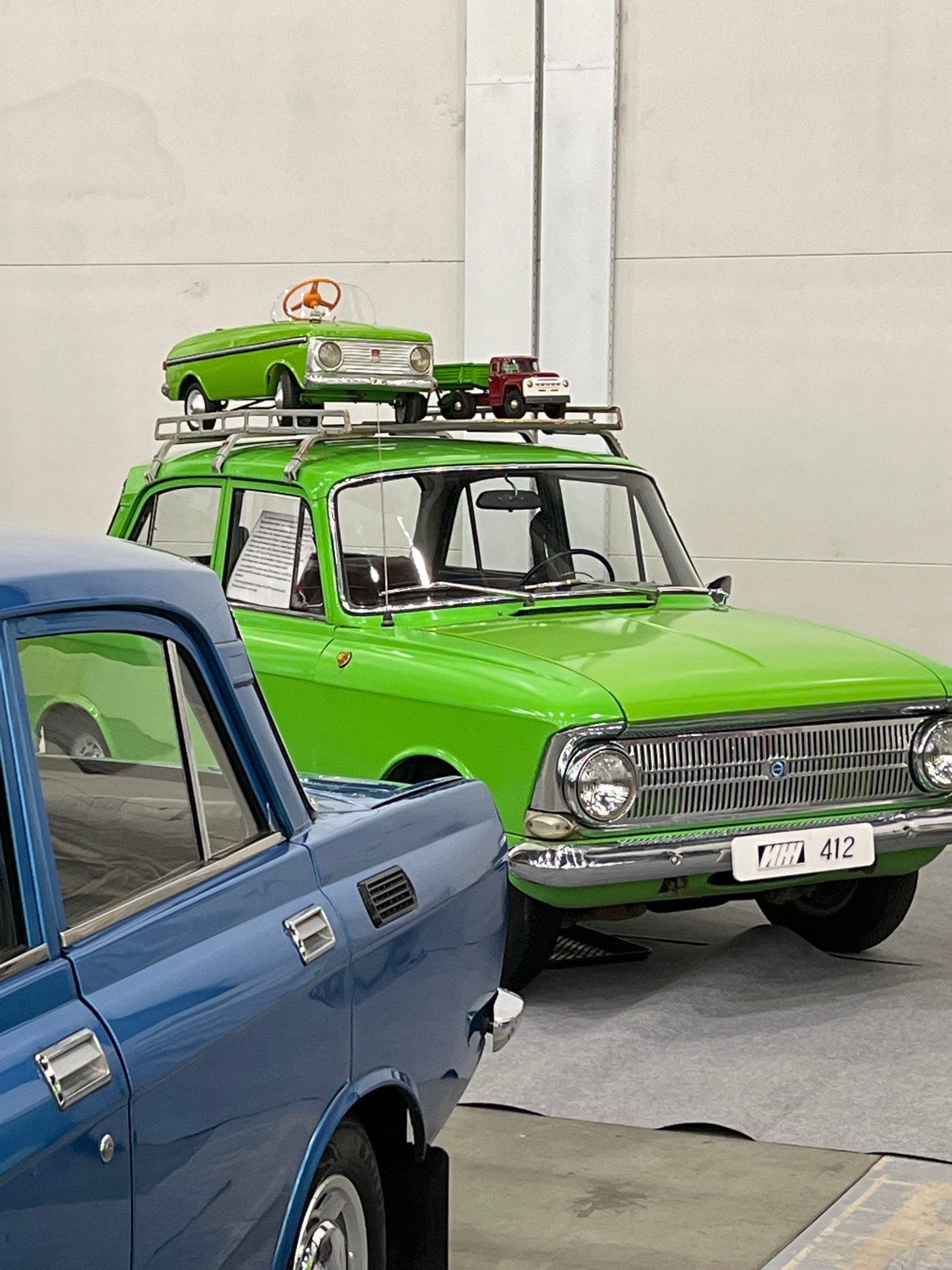 The image depicts two cars in what appears to be an indoor exhibition space. The main vehicle is a bright green classic car with a roof rack carrying smaller model cars. A blue car partially overlaps…read more