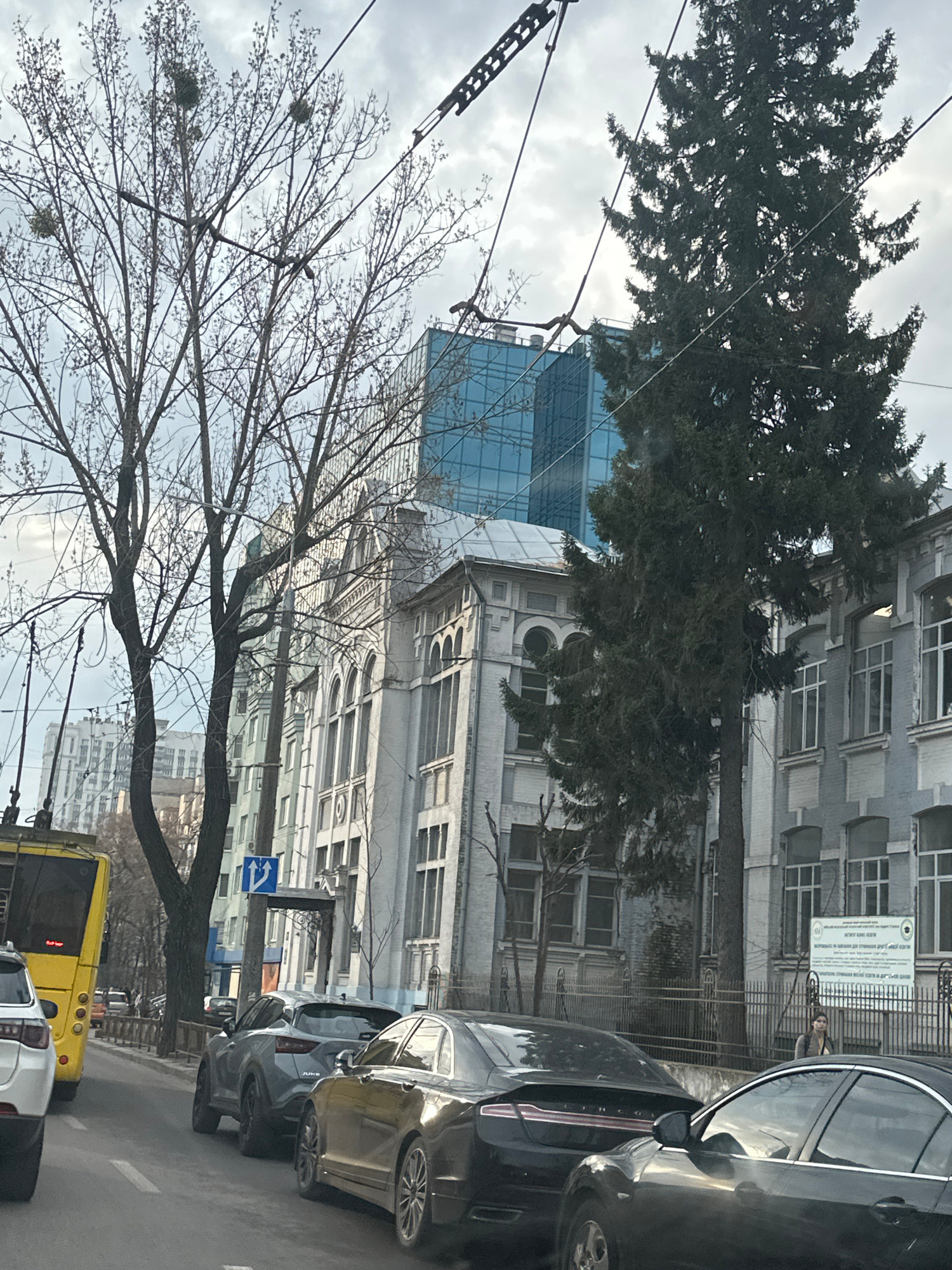 The image depicts a street scene in Kyiv, Ukraine. The view is likely from a vehicle. Cars are parked along the street. A yellow bus is visible. Tall buildings line the street, including older, light-…read more