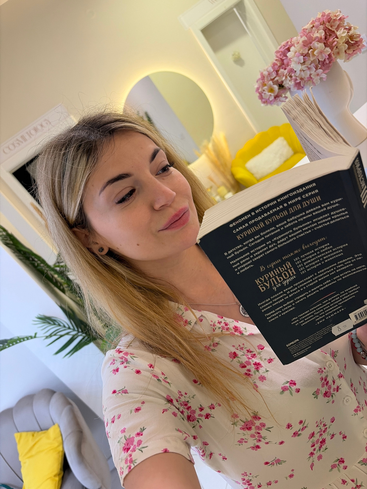A young woman is holding a book titled "Chicken Soup for the Soul." The book is in Russian, and the text on the cover suggests it is a collection of stories for the soul, promoting sharing and love. S…read more