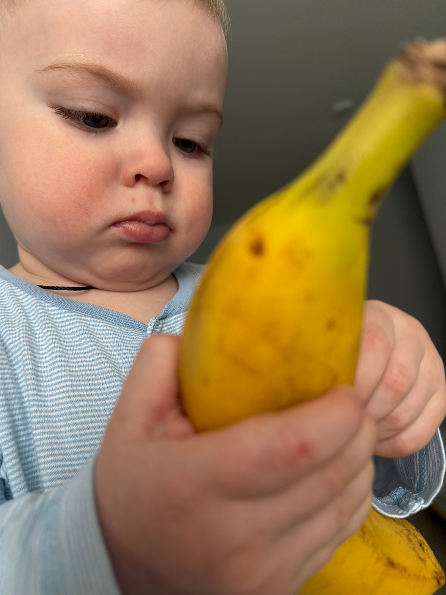 A young child with fair skin and light hair is shown holding two yellow bananas. The child is wearing a light blue and white striped shirt. The background is a solid gray color. The picture appears to…read more