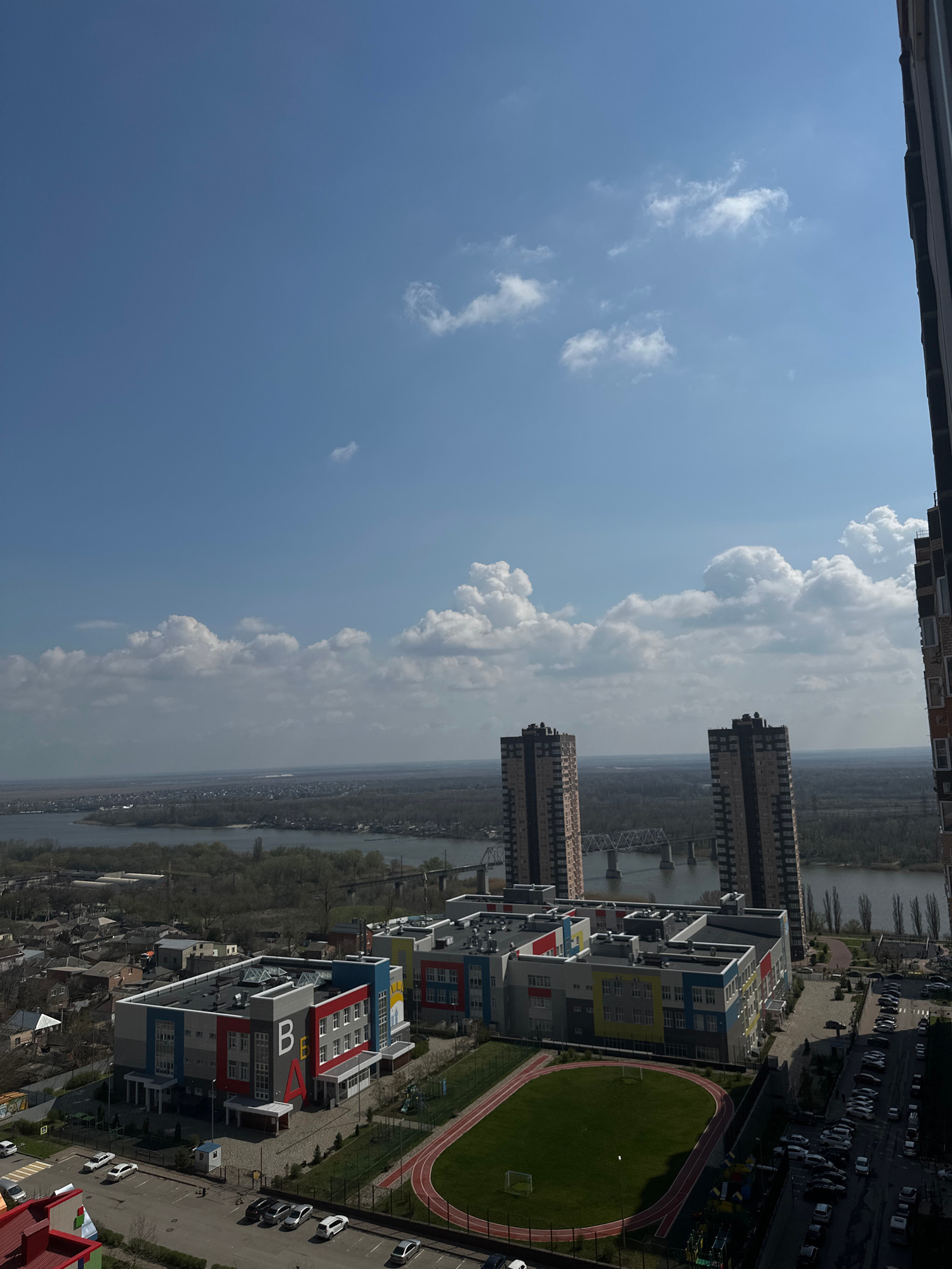 The image shows a high-angle view over Novoaleksandrovka, Russia. The sky occupies a large portion of the frame, transitioning from clear blue with scattered white clouds to denser cloud formations cl…read more
