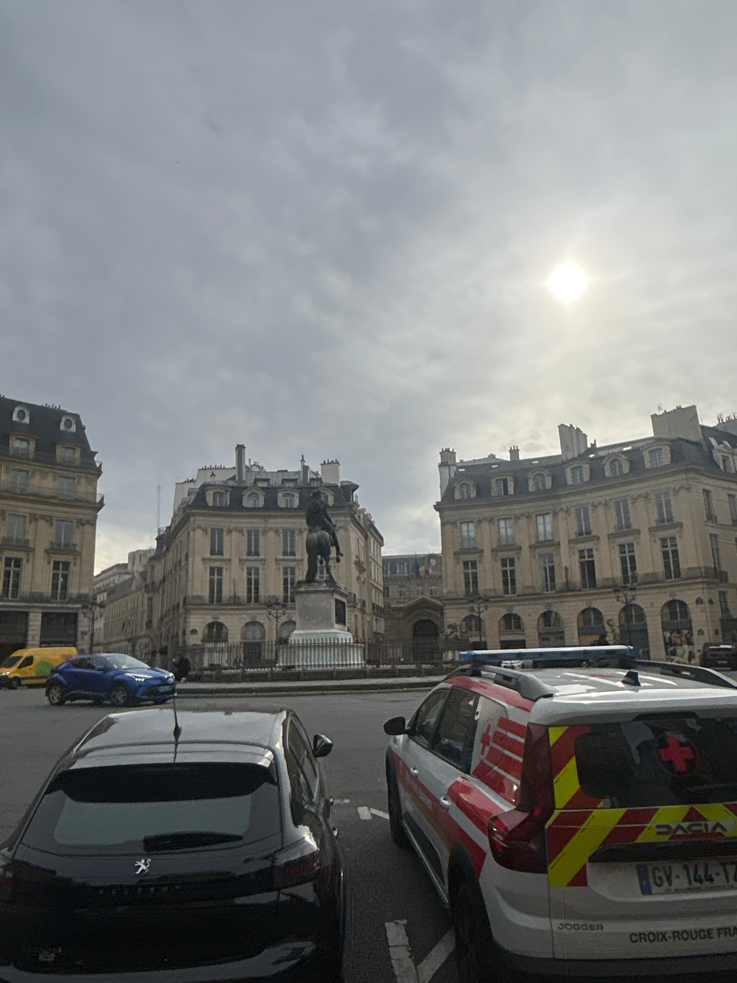 The image shows a street scene in Paris, France, on a cloudy day. In the foreground, several parked cars are visible: a black hatchback, a blue sedan, and a yellow car. A white and red Dacia Jogger am…read more