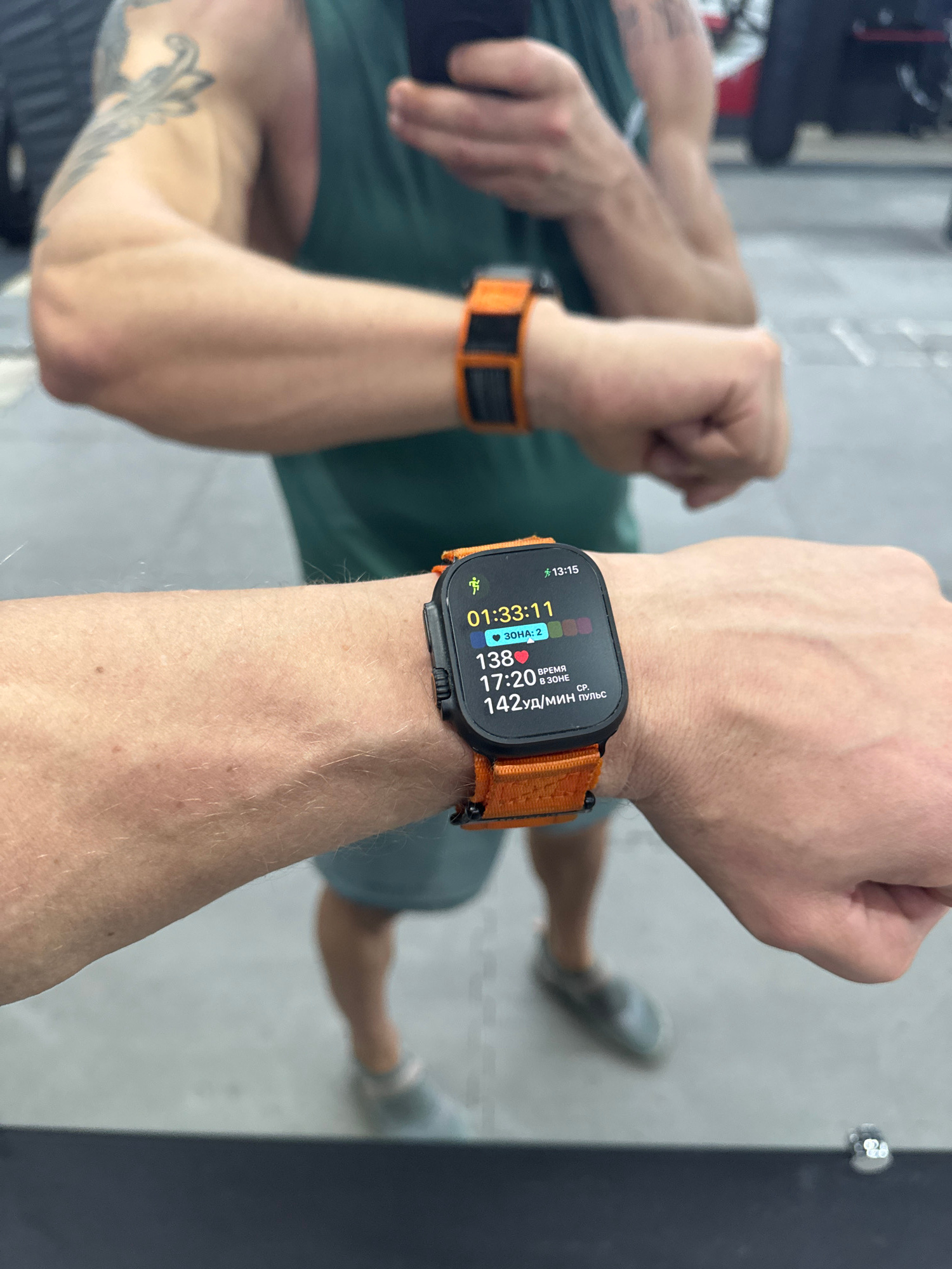 The image displays a close-up of a person's right arm, adorned with an Apple Watch Ultra featuring a striking orange fabric strap. The scene appears to be an indoor gym or fitness facility, located in…read more