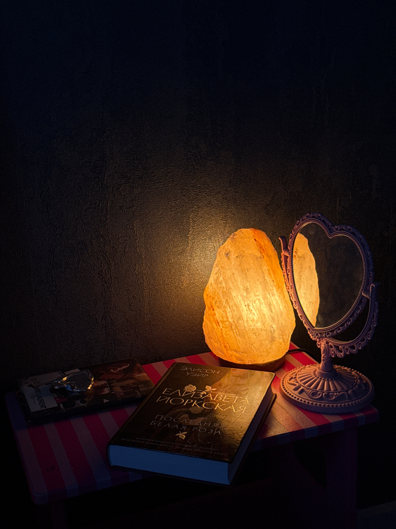 The scene is a dimly lit, close-up view of several objects resting on a dark surface. A glowing, orange-colored Himalayan salt lamp is prominently featured, casting light on its surroundings. Above th…read more
