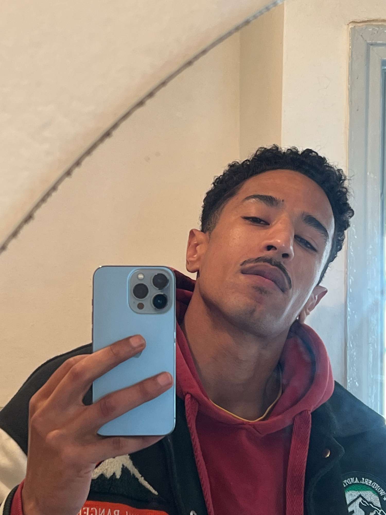 A man with curly black hair and a mustache is holding a blue iPhone and taking a selfie in what appears to be a mirror. He is wearing a red hooded sweatshirt underneath a black jacket with white accents and an emblem on the upper right. The reflection suggests the man is indoors. The background is primarily white and includes a window with a gray frame. There is no indication that this photo was taken in Tangier, Morocco. | Open Wire