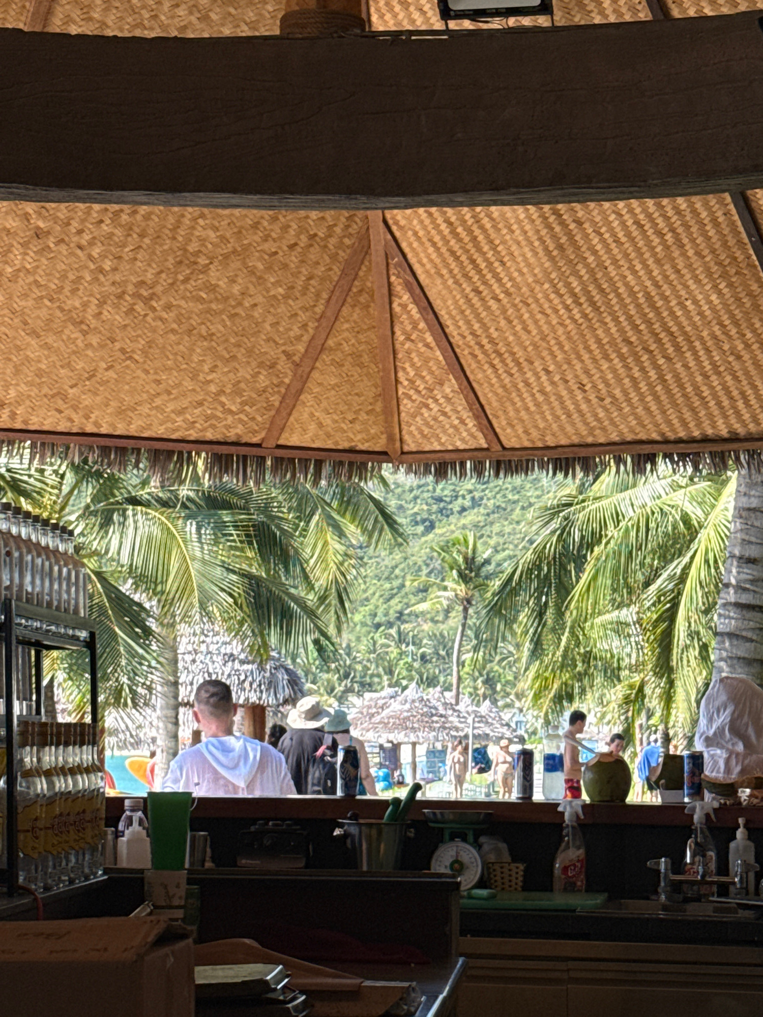The scene is an outdoor bar in Nha Trang, Vietnam, viewed from inside a structure with a dark overhead beam and a woven straw roof featuring a fringed edge. In the foreground, a dark counter displays…read more