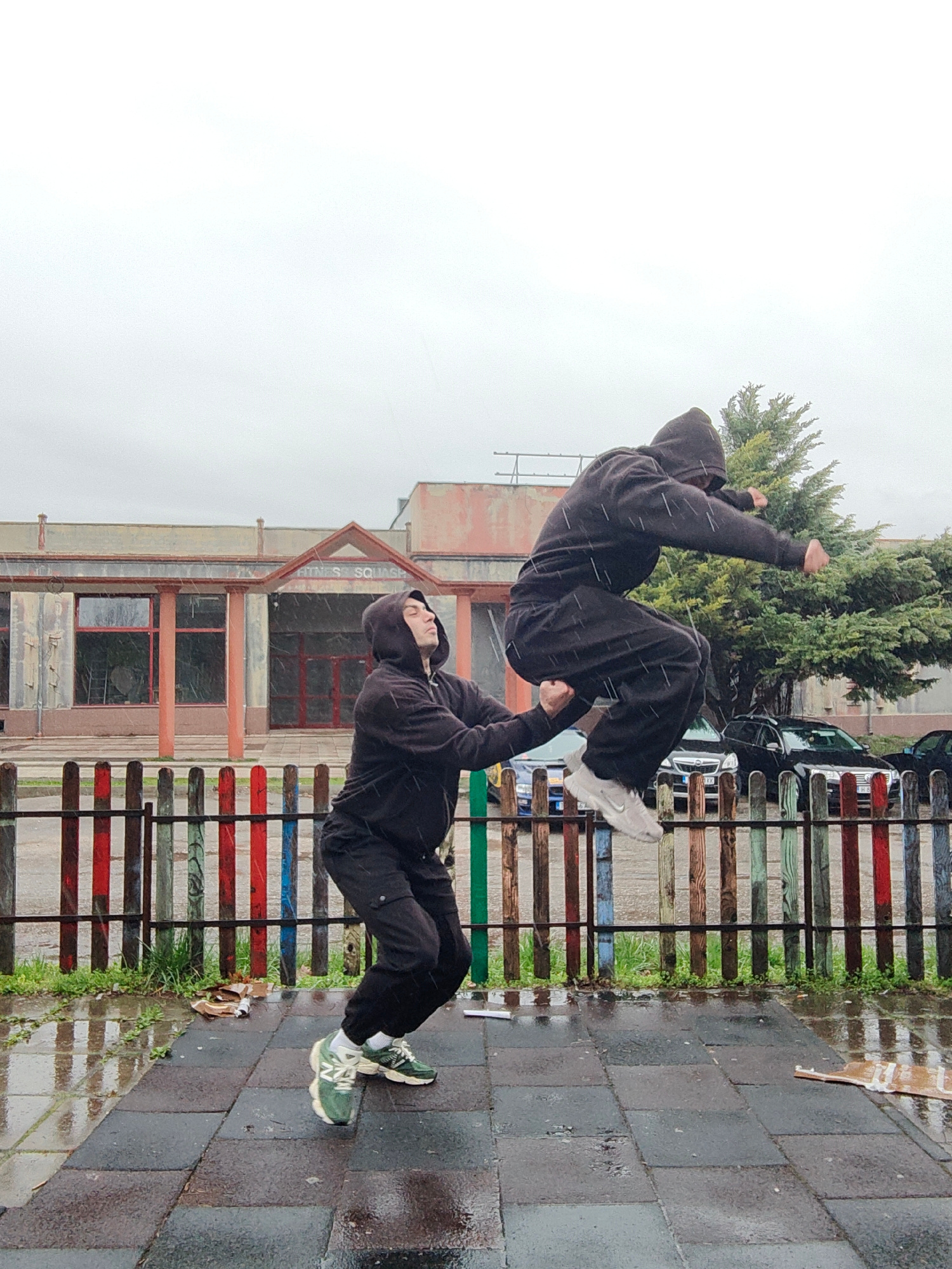 Two people are engaged in an activity outdoors. Both individuals are wearing dark-colored hooded tracksuits. One person is crouched and steadying the other, who is elevated in the air as if jumping ov…read more