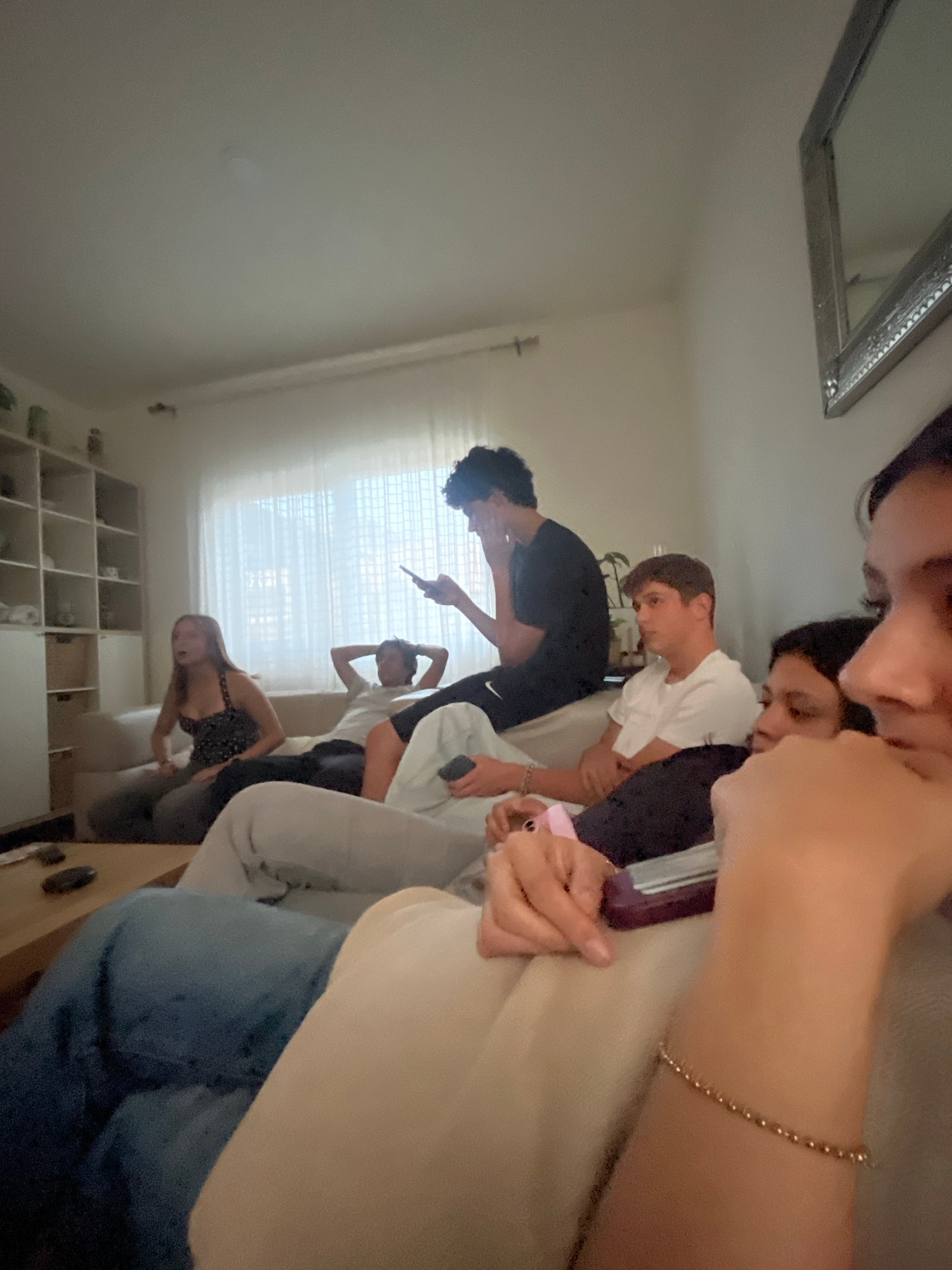 An indoor scene captures a casual gathering of several young people, appearing to be in a living room or common area. The image is taken from a low angle, rotated on its side, suggesting a selfie or g…read more