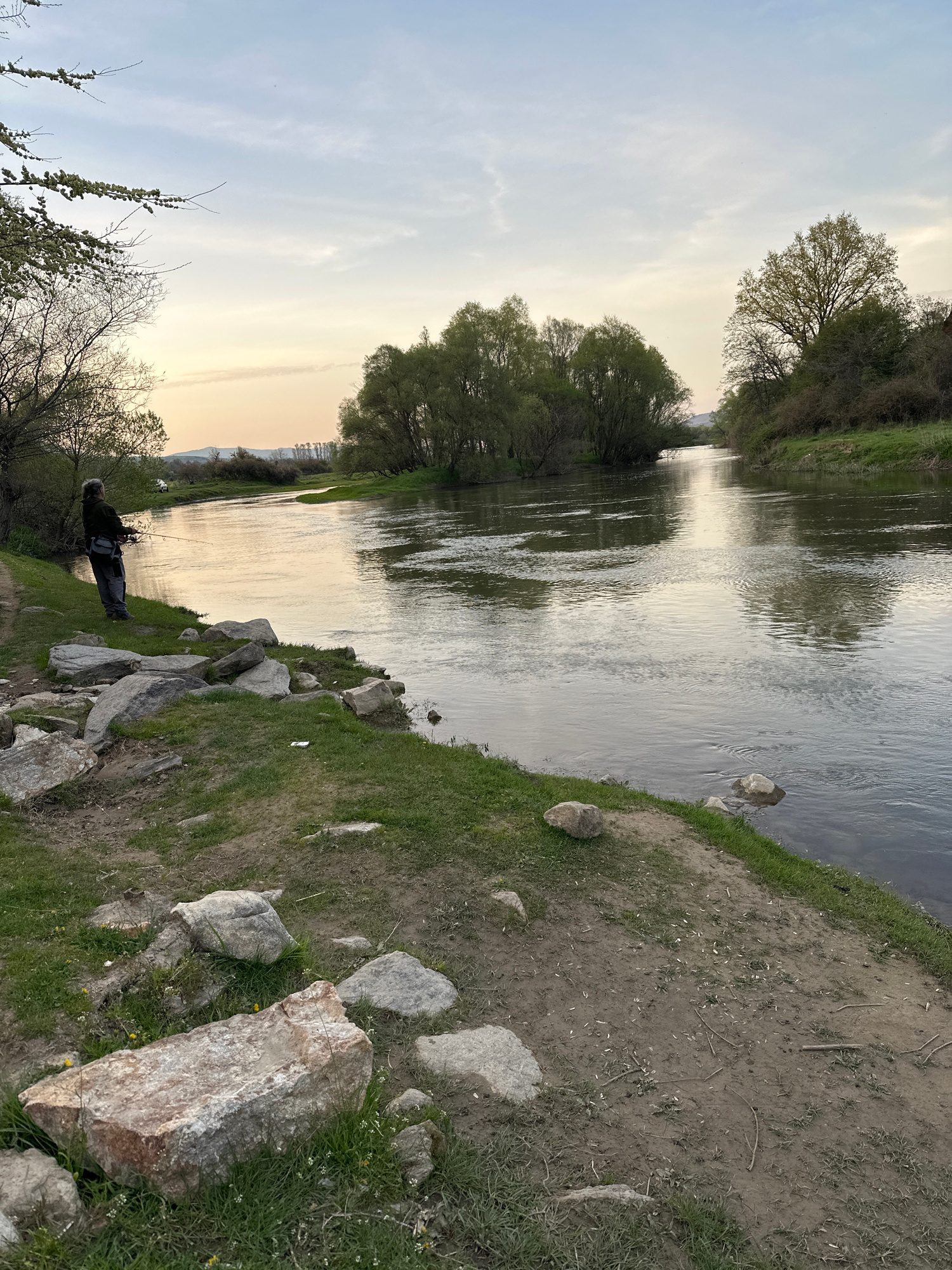 The image depicts a river scene near Krumovo, Bulgaria. The river, reflecting the sky, flows between tree-lined banks. On the right bank, a rocky shoreline transitions into grass and dirt. A person st…read more