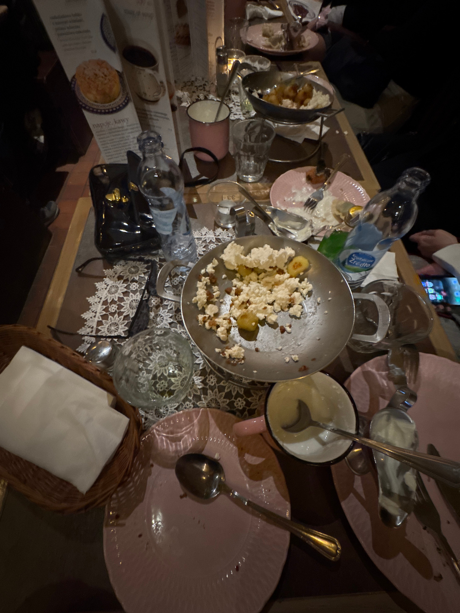The image shows a cluttered table at a restaurant, likely after a meal, in Warsaw, Poland. The table is covered with dirty dishes, including pink plates, a silver pan with leftover food, a mug, glasse…read more