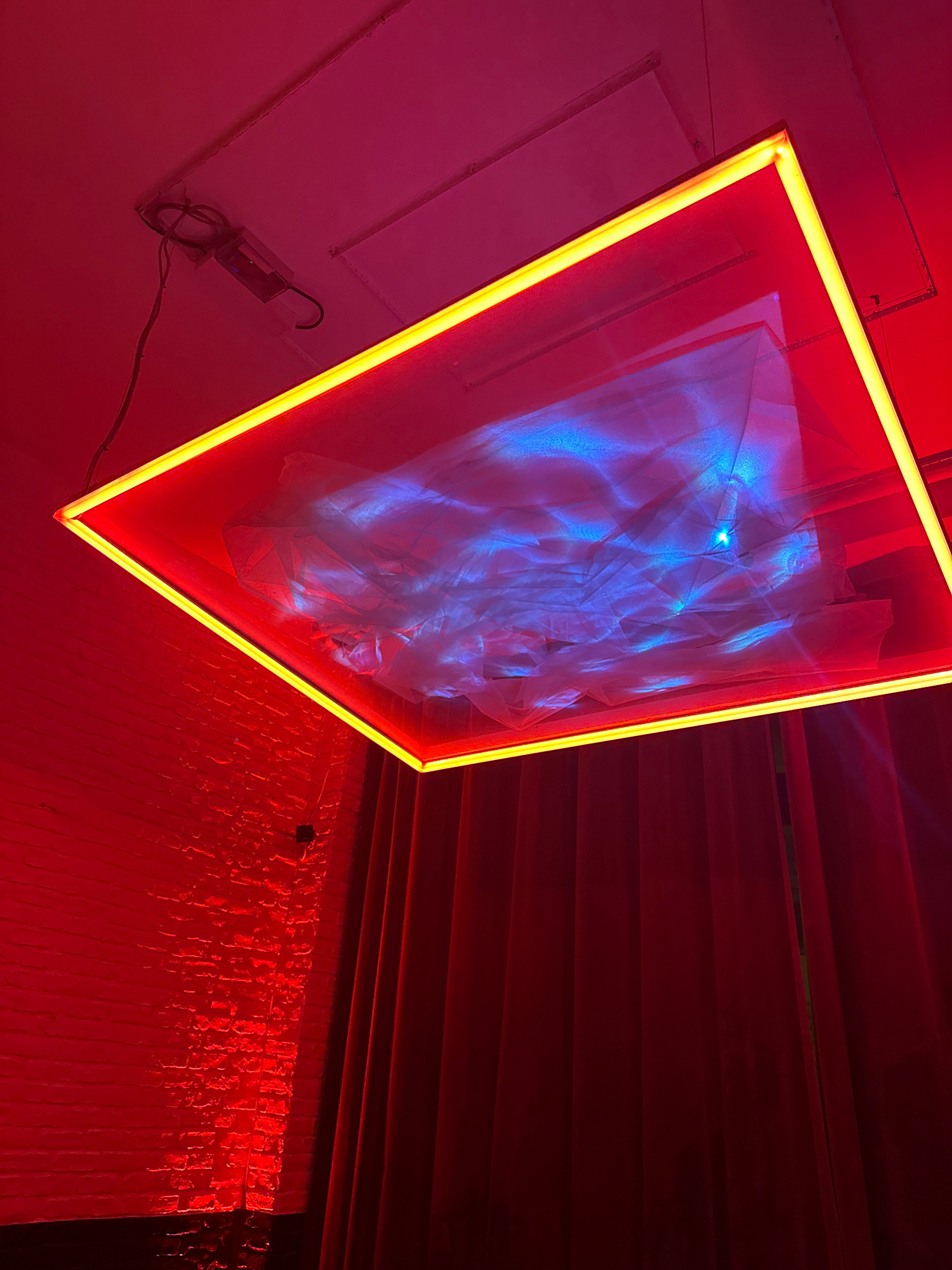 An indoor scene in Paris, France, features a prominent rectangular light installation suspended from a light-colored ceiling. The fixture's perimeter is outlined by a bright yellow-orange neon or LED…read more