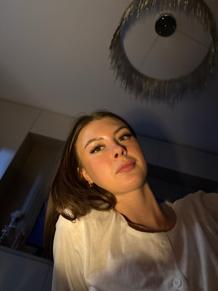 The image displays a close-up, upward-angled shot of a single female subject indoors. The subject, a young adult with brown hair and light skin, is positioned in the lower center, looking slightly upw…read more