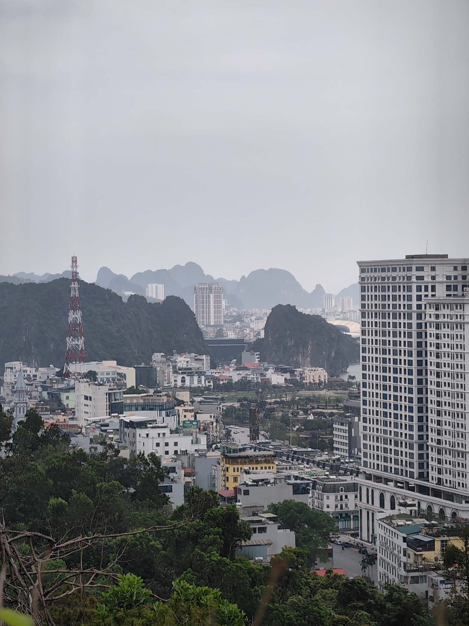 This image captures a panoramic, hazy daytime view of an urban landscape set against dramatic karst topography, consistent with Hong Gai Ward, Vietnam. In the immediate foreground, dark green tree fo…read more