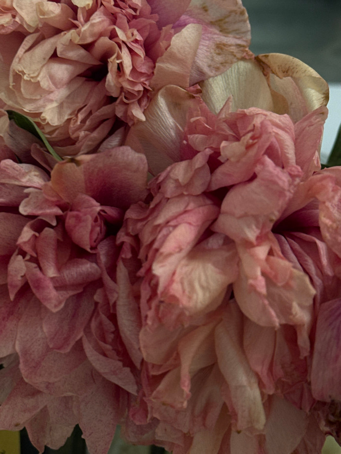 The scene presents a close-up, high-angle view of multiple wilting pink flowers, likely peonies. The blooms feature numerous densely packed, ruffled petals ranging in color from blush pink to a deeper…read more