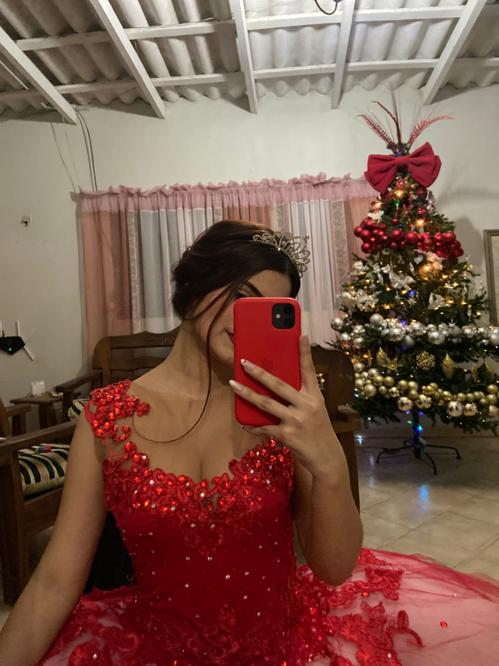A woman in a red, lace-trimmed gown and a tiara holds a red smartphone, presumably taking a selfie. The background features a decorated Christmas tree adorned with red and silver ornaments, a pink cur…read more