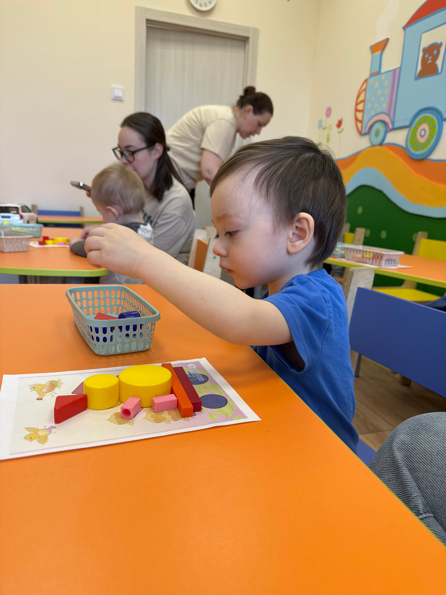 A child in a blue shirt is at a table with a shape-sorting activity in Izhevsk, Russia. There is a white sheet with shapes outlined on it and a basket of shapes. Other children and adults are present…read more
