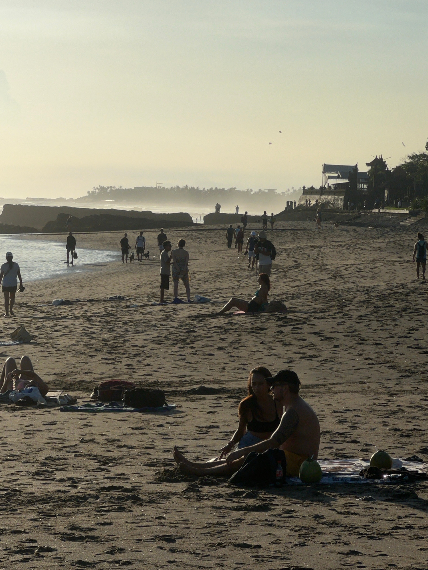 The image depicts a hazy beach scene in North Kuta, Indonesia, likely during sunrise or sunset, indicated by the warm, atmospheric light and long shadows stretching across the dark sand. The beach, po…read more