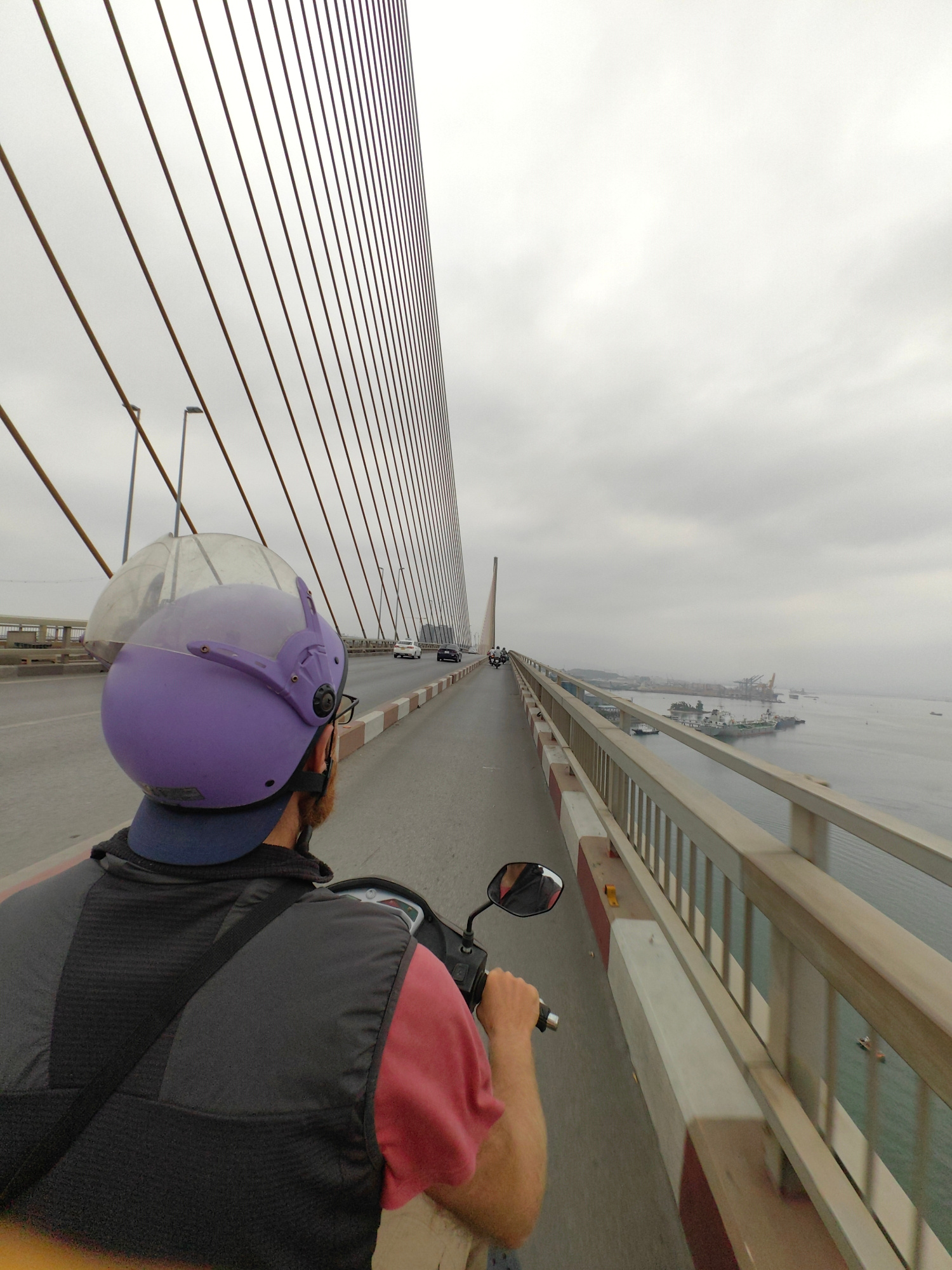 A person is riding a scooter across a suspension bridge, identified as a bridge in Hong Gai Ward, Vietnam, as suggested by the port and industrial facilities in the background. The rider wears a purpl…read more