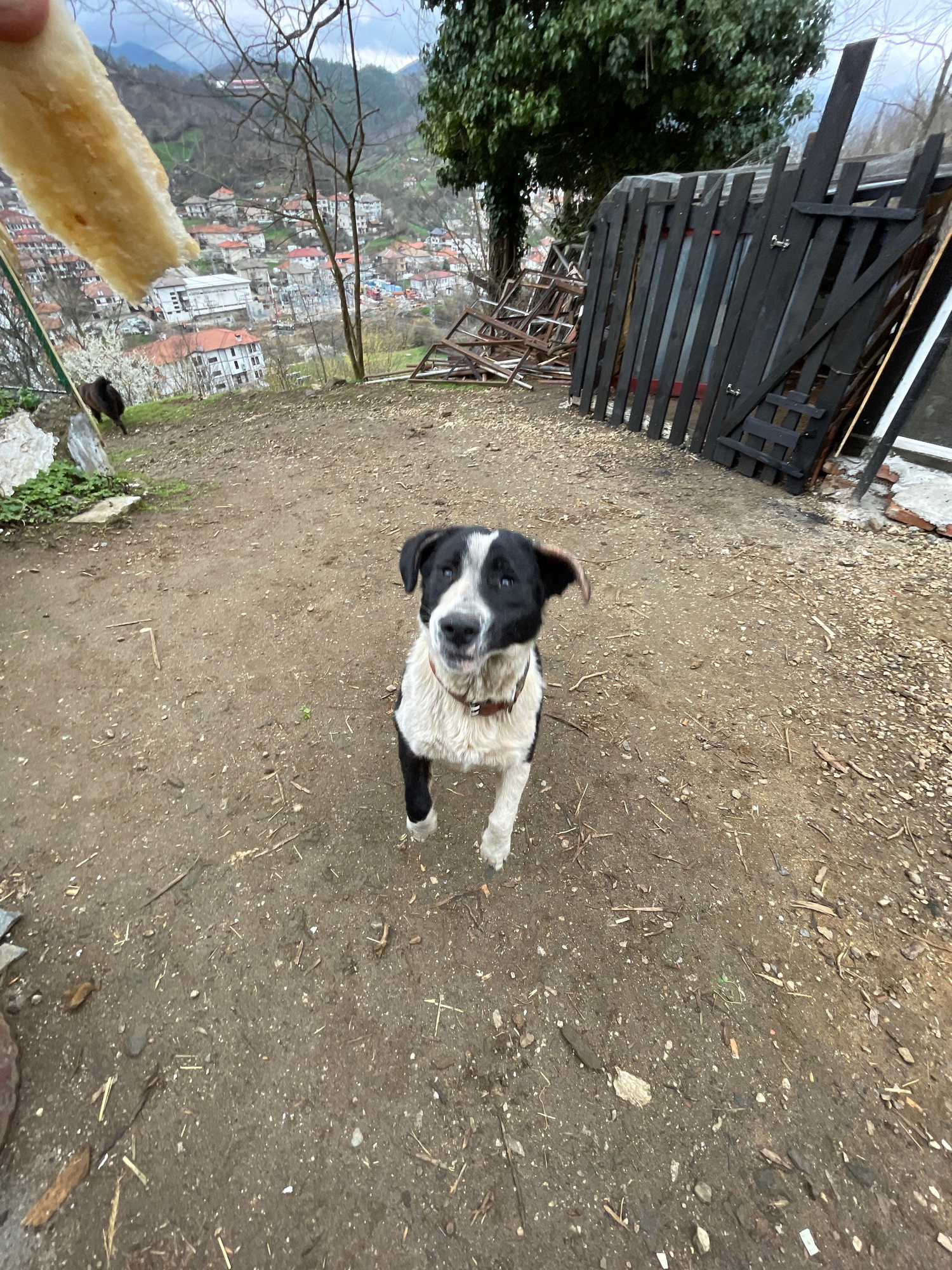 A medium-sized, black and white dog with a brown collar stands on a dirt and gravel ground. A person holds a piece of bread or other food item out to the dog. In the background is a view of the city of Zlatograd, Bulgaria. A dark fence-like structure is to the left of the dog. The ground is covered with small pieces of wood and other debris. | Open Wire