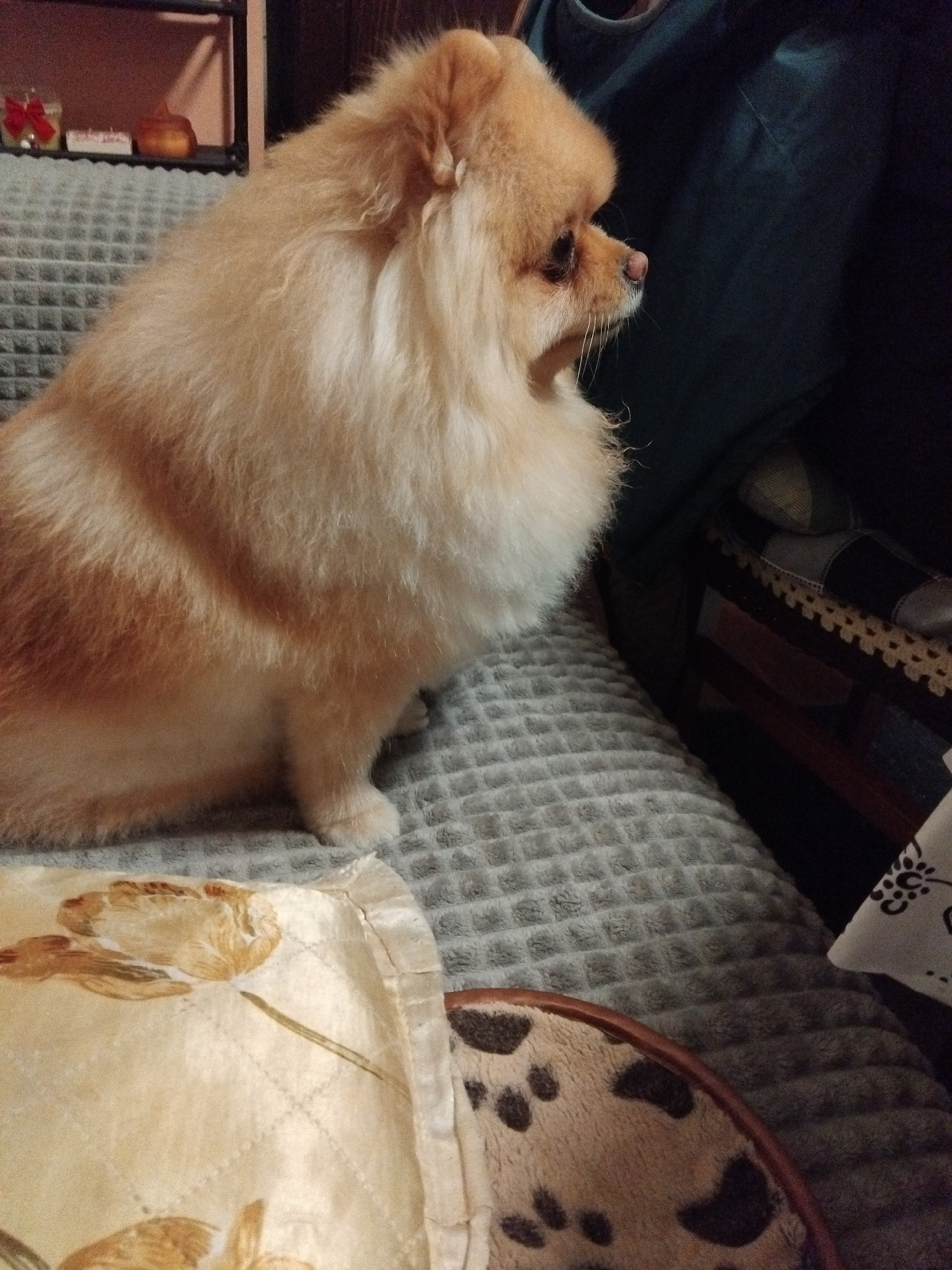 A tan Pomeranian-like dog is lying on a gray textured fabric, likely a blanket or sofa. The dog is oriented towards the upper left of the frame, with its head tilted upwards. The background is clutterβ¦read more