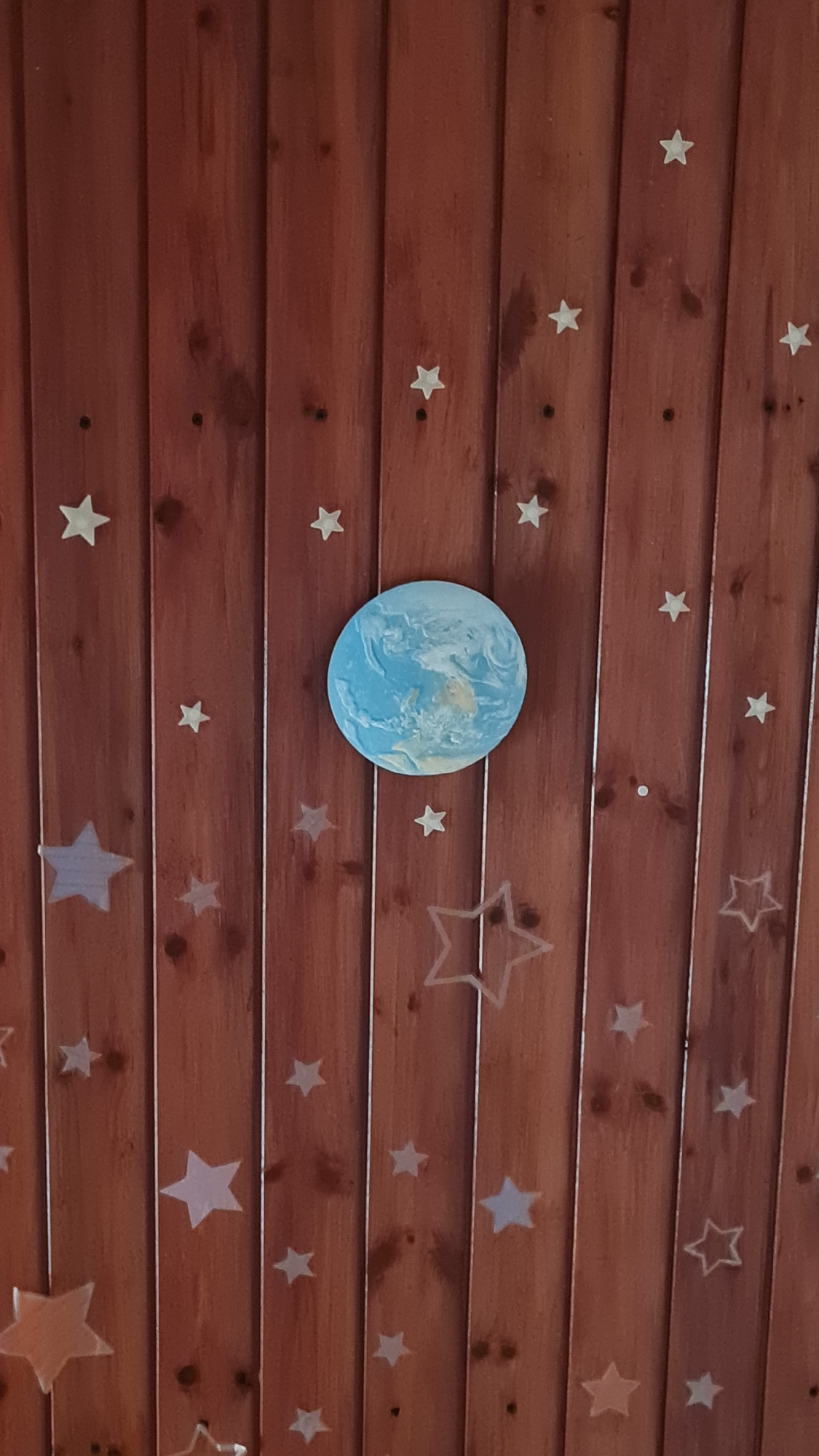 A close-up shot reveals a wooden wall, comprised of horizontal planks with a reddish-brown hue. Adorning the wall are various star-shaped decorations, some solid and some just outlines. In the center,…read more