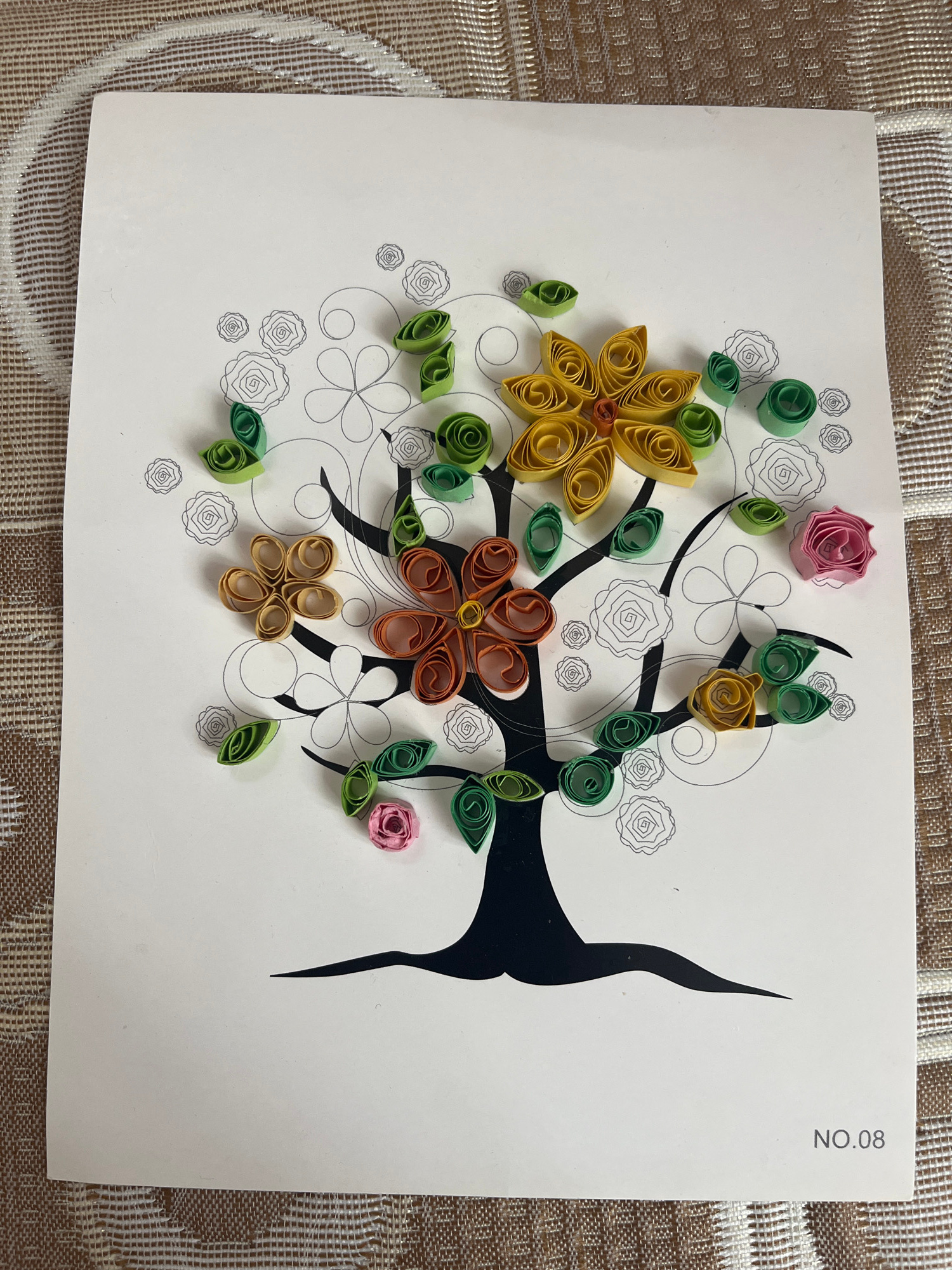The image shows a piece of handmade artwork on a white background with a beige and brown textured background. The artwork appears to be a tree design incorporating quilling techniques. There is a blacβ¦read more