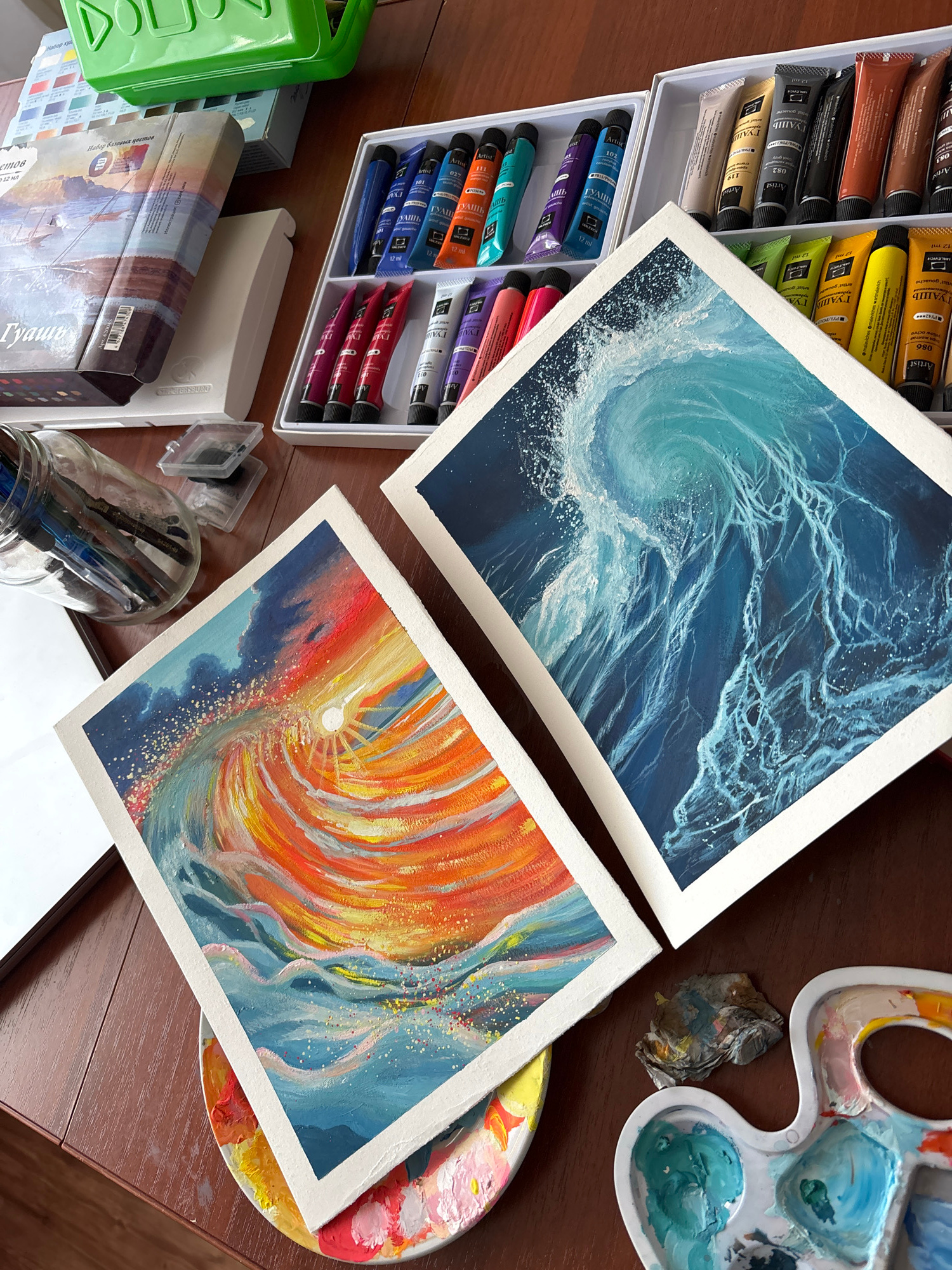 The image is an overhead shot of an artist's workspace, likely in a home setting, as indicated by the wooden table surface. Two completed paintings are centrally positioned. The upper painting feature…read more