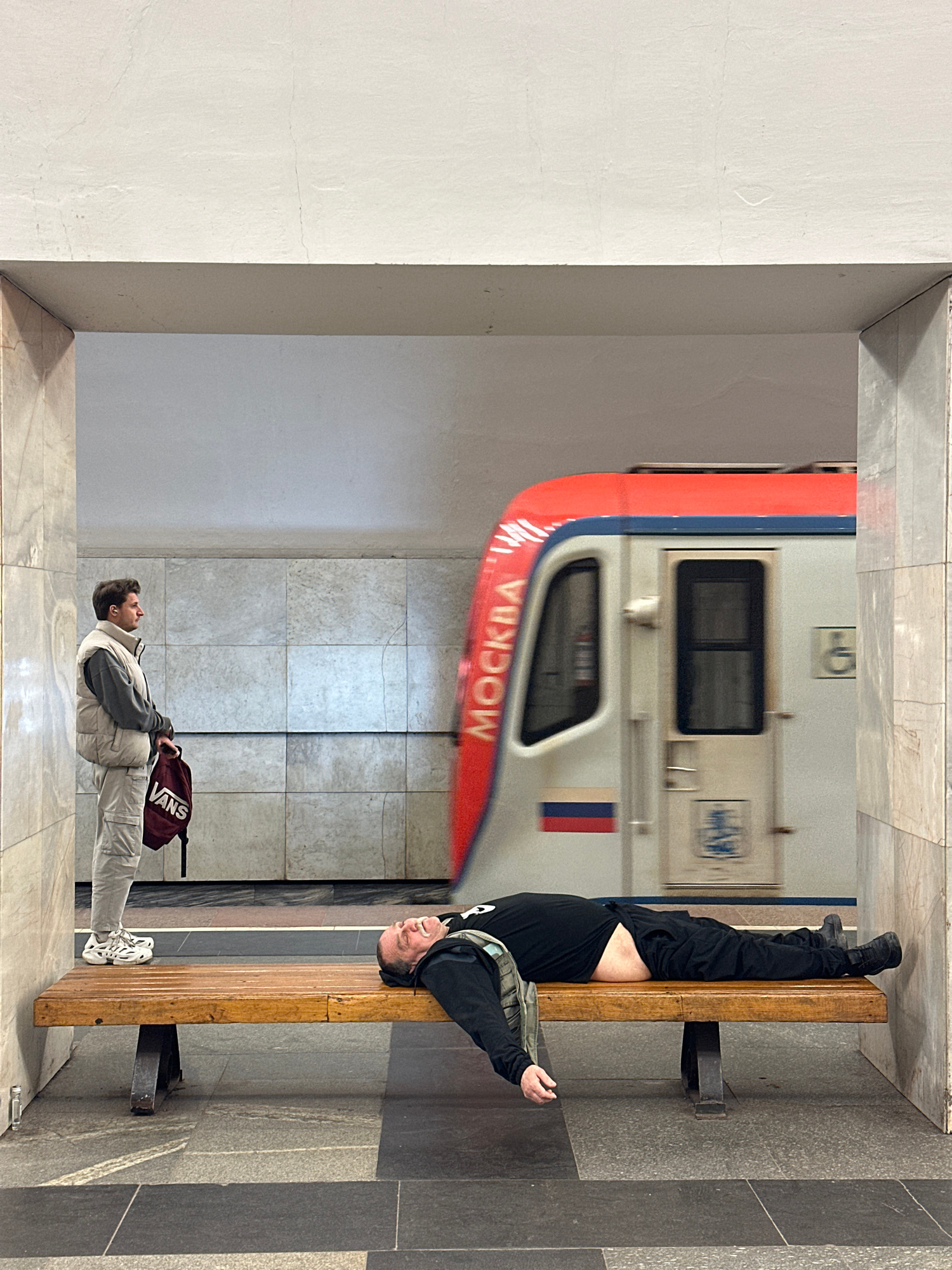 The image depicts the interior of a metro station in Moscow, Russia. A train is moving along the tracks with "MOCKBA" (Moscow in Russian) written on its side. A man lies on a bench with his head hangi…read more