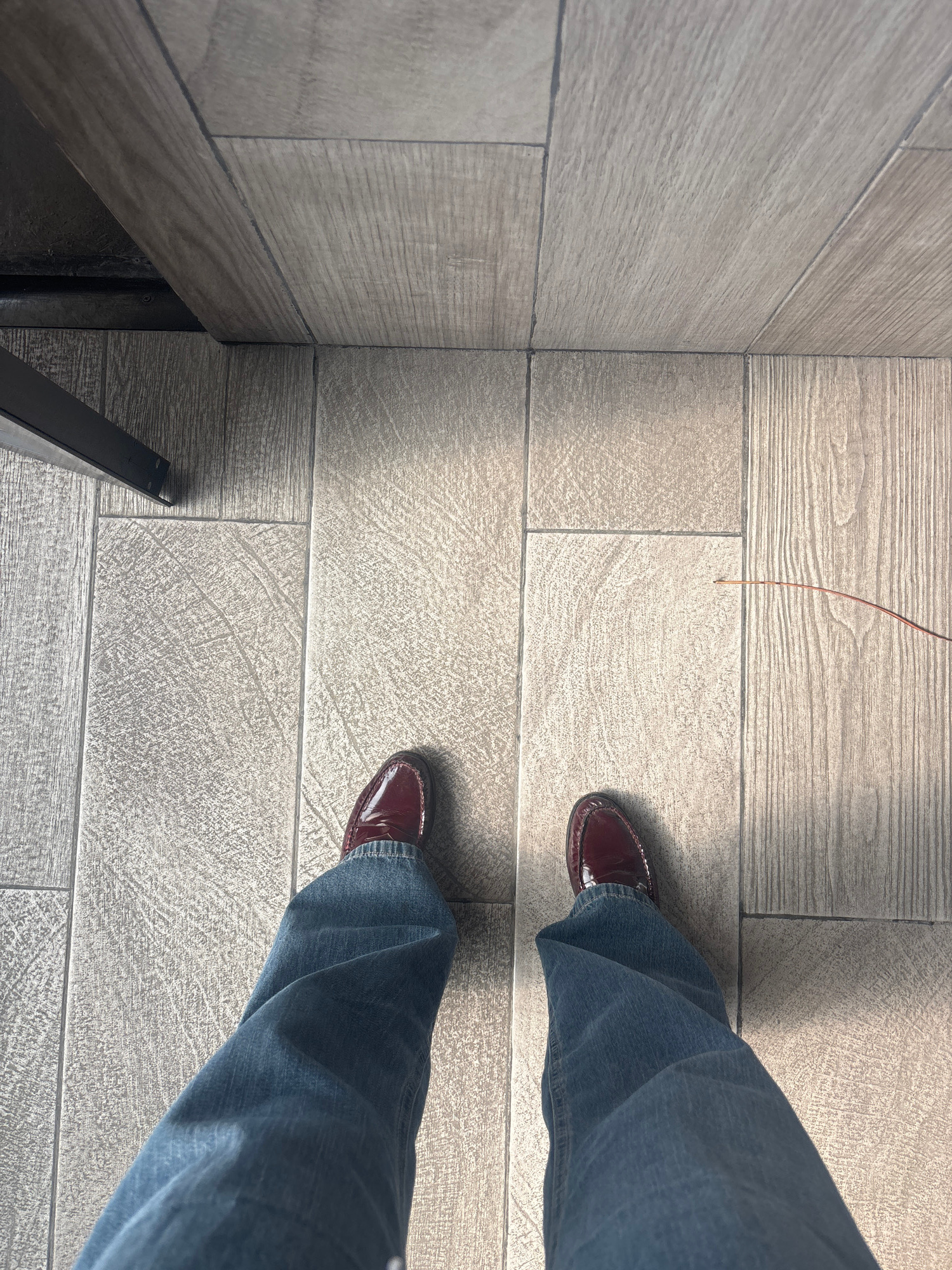 The image shows a top-down view of a person's lower body, wearing blue jeans and burgundy loafers, standing on a tiled floor. The floor consists of rectangular tiles with a textured, stone-like patter…read more