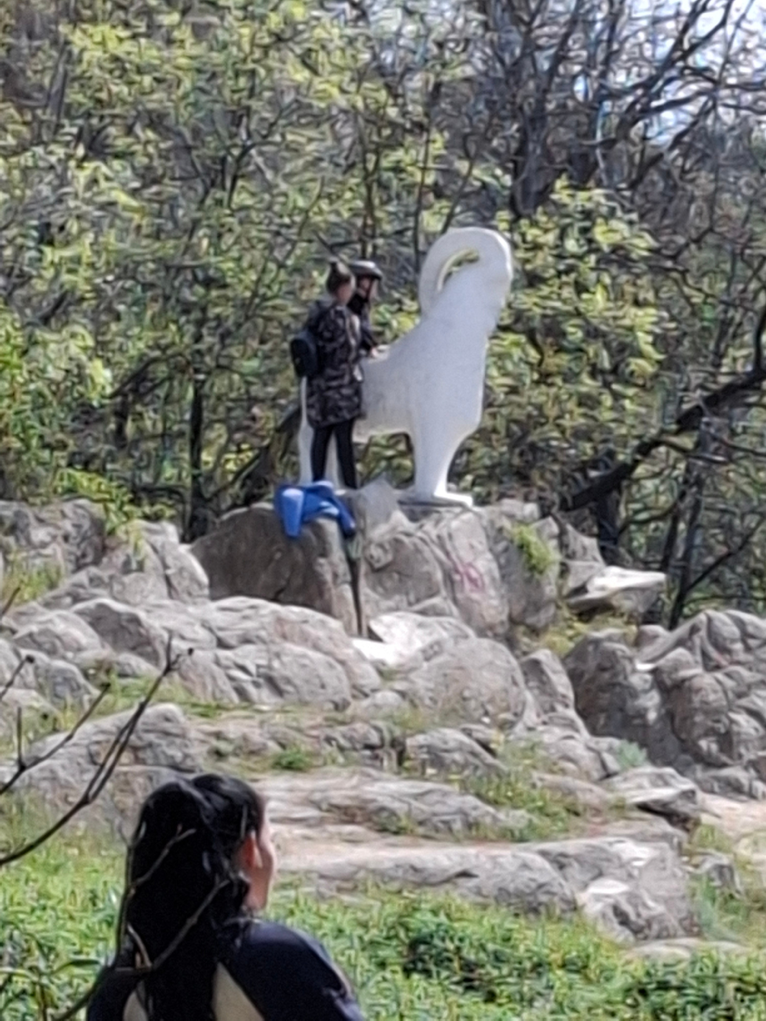 The image captures an outdoor scene featuring a large, white, abstract sculpture set amidst a rocky, vegetated landscape, likely a hillside or park in Plovdiv, Bulgaria. The sculpture, which resembles…read more